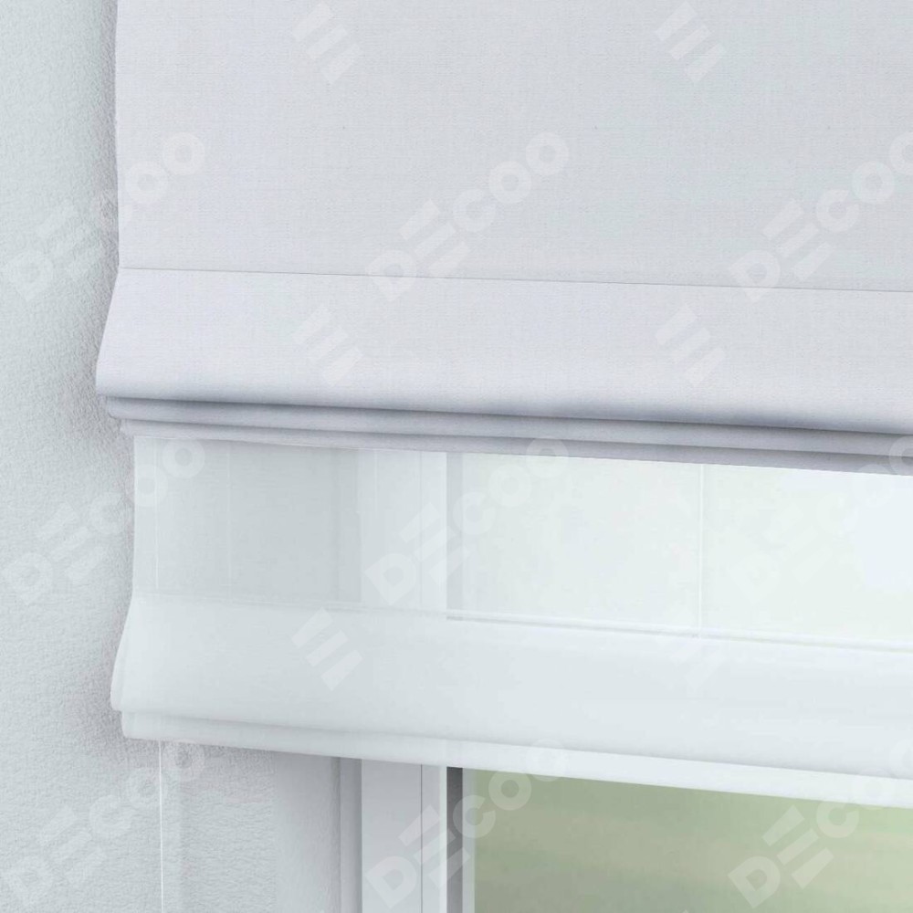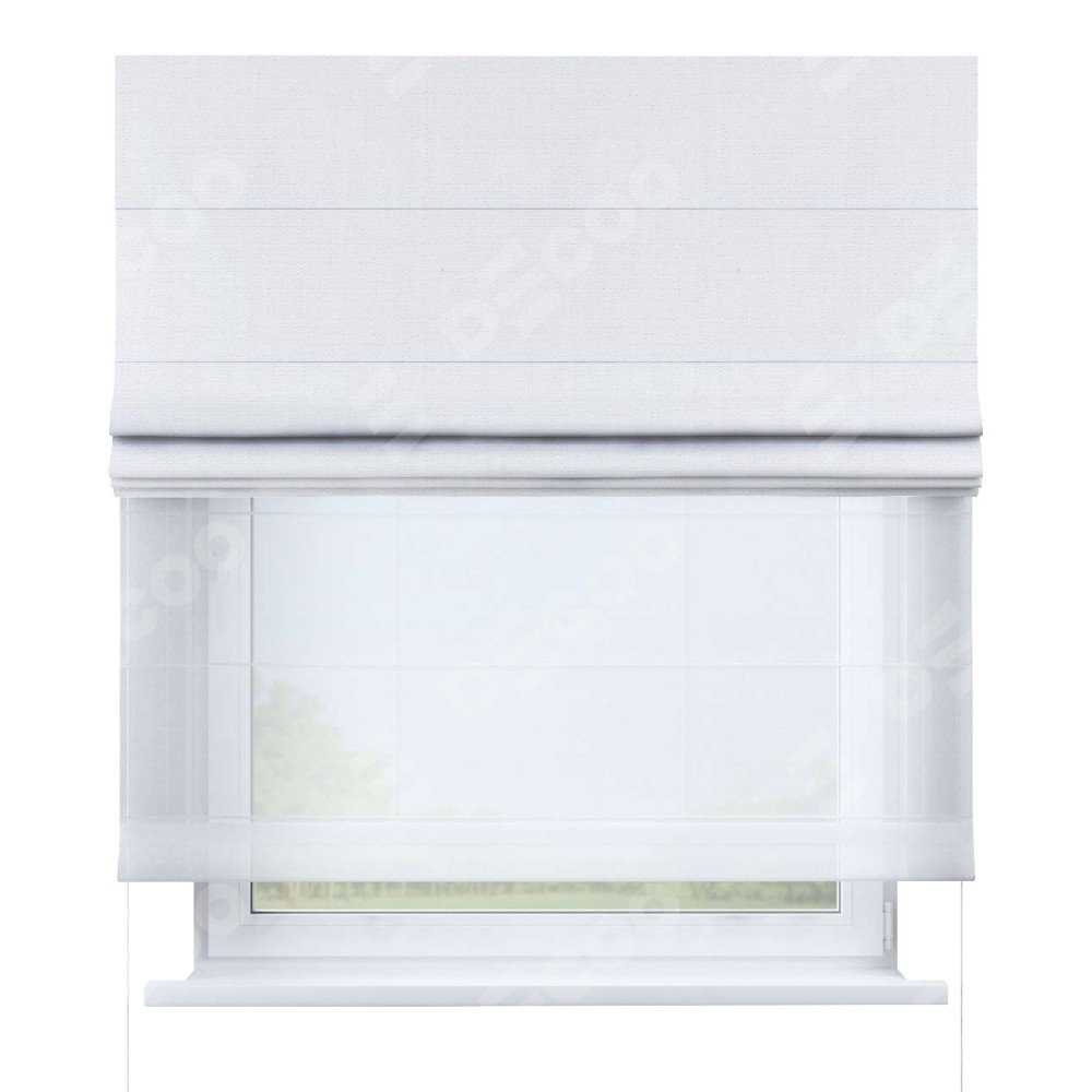 Римская штора день-ночь (двойная) от производителя «Cortin», используется для проёма. Пошита из двух полотен, основная ткань лён белый артикул 53430, вторая ткань тюль (по стандарту используется тюль белого цвета артикул V-01). Имеет универсальный механизм и подходит для монтажа: на потолок, на стену и в нишу.