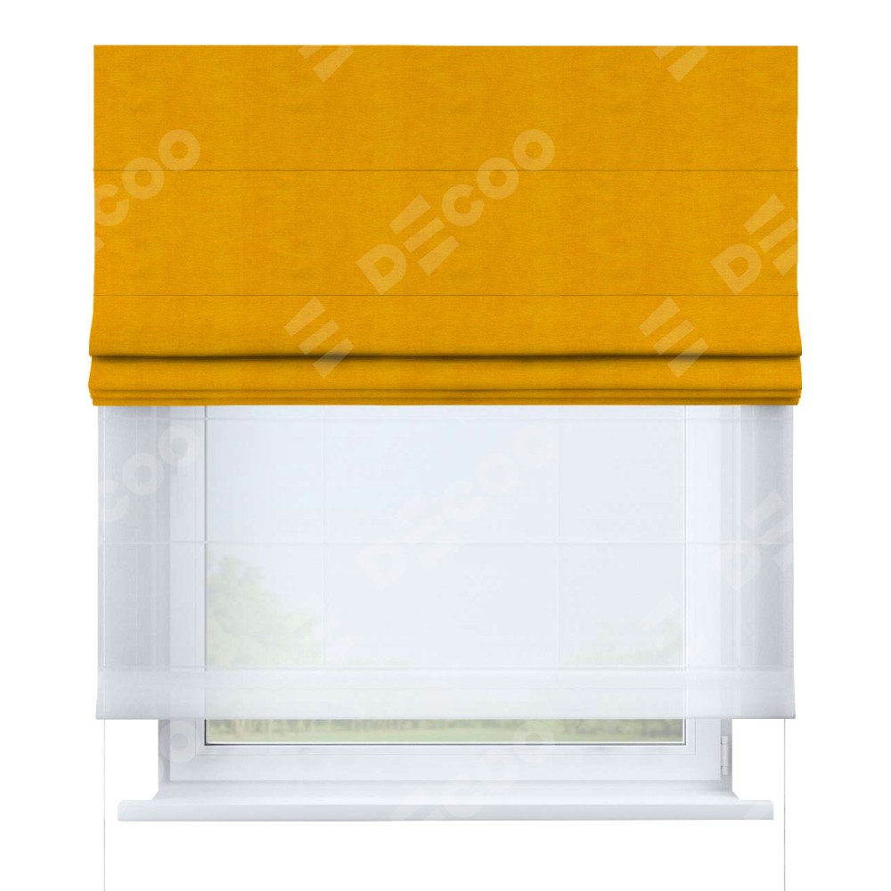 Римская штора день-ночь производителя «Cortin», используется для проёма, пошита из двух полотен, с лицевой стороны вельвет желтый артикул 85547, вторая ткань тюль (по стандарту комплектуется тюль белого цвета артикул V-01). Имеет универсальный механизм и подходит для монтажа: на потолок, на стену и в нишу.