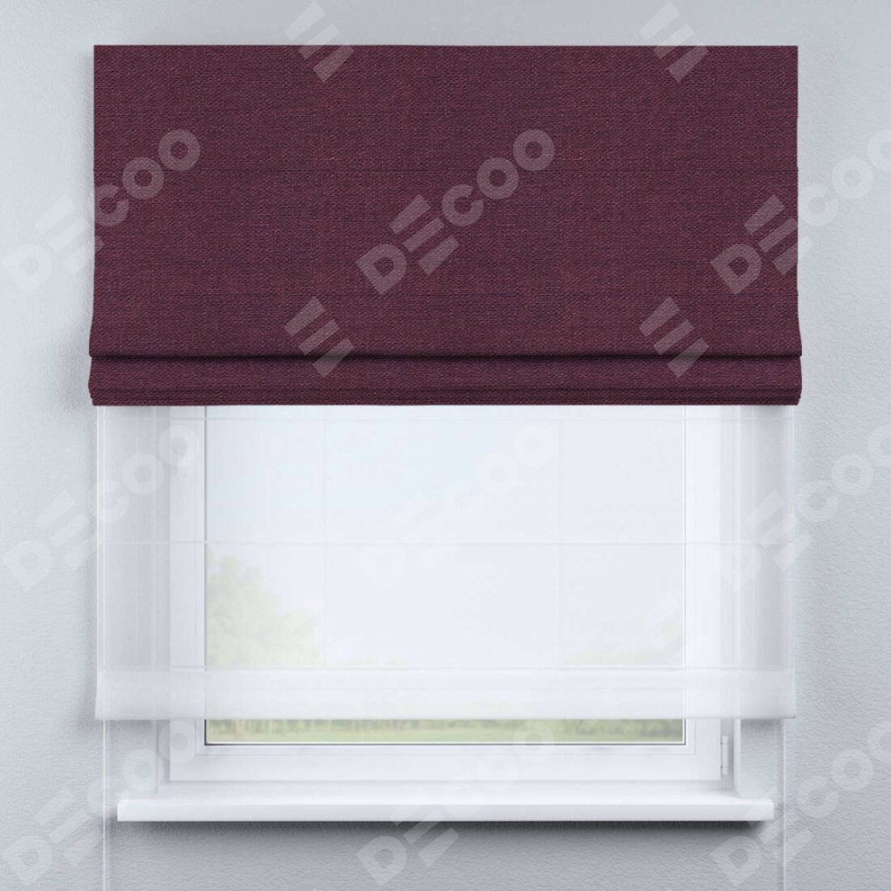 Римская штора день-ночь производителя «Cortin», используется для проёма, пошита из двух полотен, с лицевой стороны лён фиолетовый артикул 85907, вторая ткань тюль (по стандарту комплектуется тюль белого цвета артикул V-01). Имеет универсальный механизм и подходит для монтажа: на потолок, на стену и в нишу.