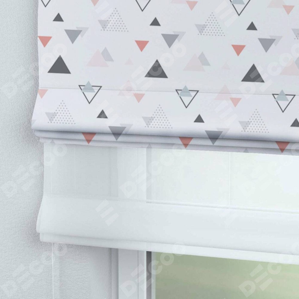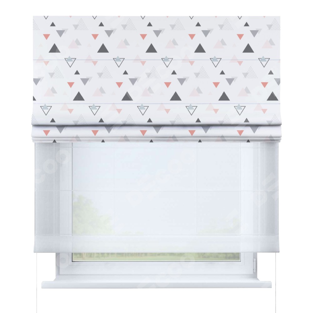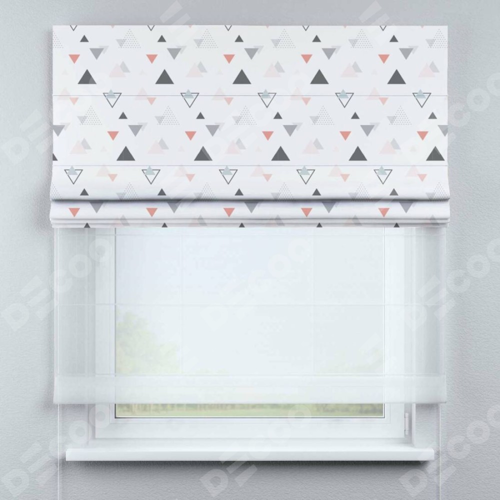 Римская штора день-ночь производителя «Cortin», используется для проёма, пошита из двух полотен, с лицевой блэкаут с нанесением сублимационной печати «Дождь из треугольников», вторая ткань тюль (по стандарту комплектуется тюль белого цвета артикул V-01). Имеет универсальный механизм и подходит для монтажа: на потолок, на стену и в нишу.