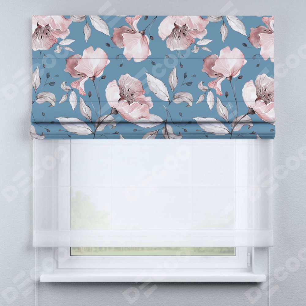 Римская штора день-ночь производителя «Cortin», используется для проёма, пошита из двух полотен, с лицевой блэкаут с нанесением сублимационной печати «Розовая лагуна», вторая ткань тюль (по стандарту комплектуется тюль белого цвета артикул V-01). Имеет универсальный механизм и подходит для монтажа: на потолок, на стену и в нишу.