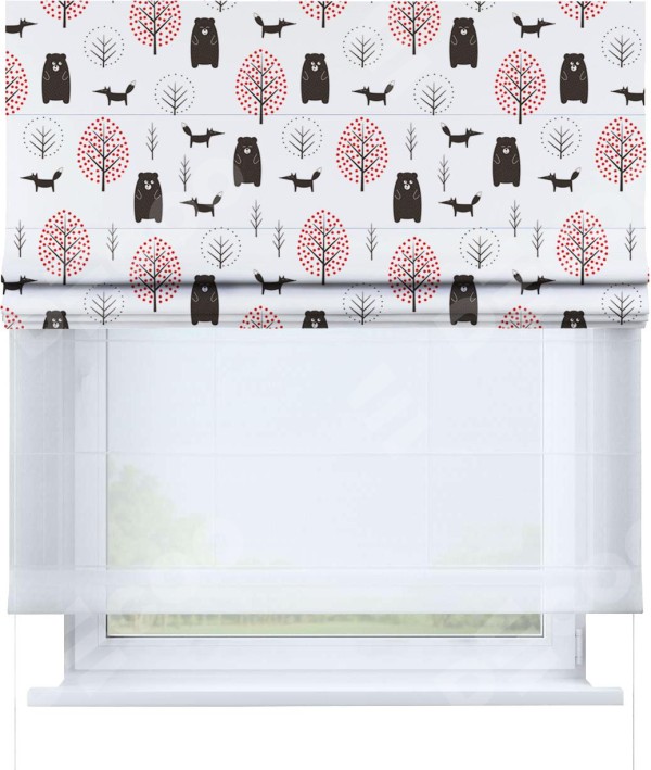 Римская штора день-ночь производителя «Cortin», используется для проёма, пошита из двух полотен, с лицевой блэкаут с нанесением сублимационной печати «Сканди лес», вторая ткань тюль (по стандарту комплектуется тюль белого цвета артикул V-01). Имеет универсальный механизм и подходит для монтажа: на потолок, на стену и в нишу.