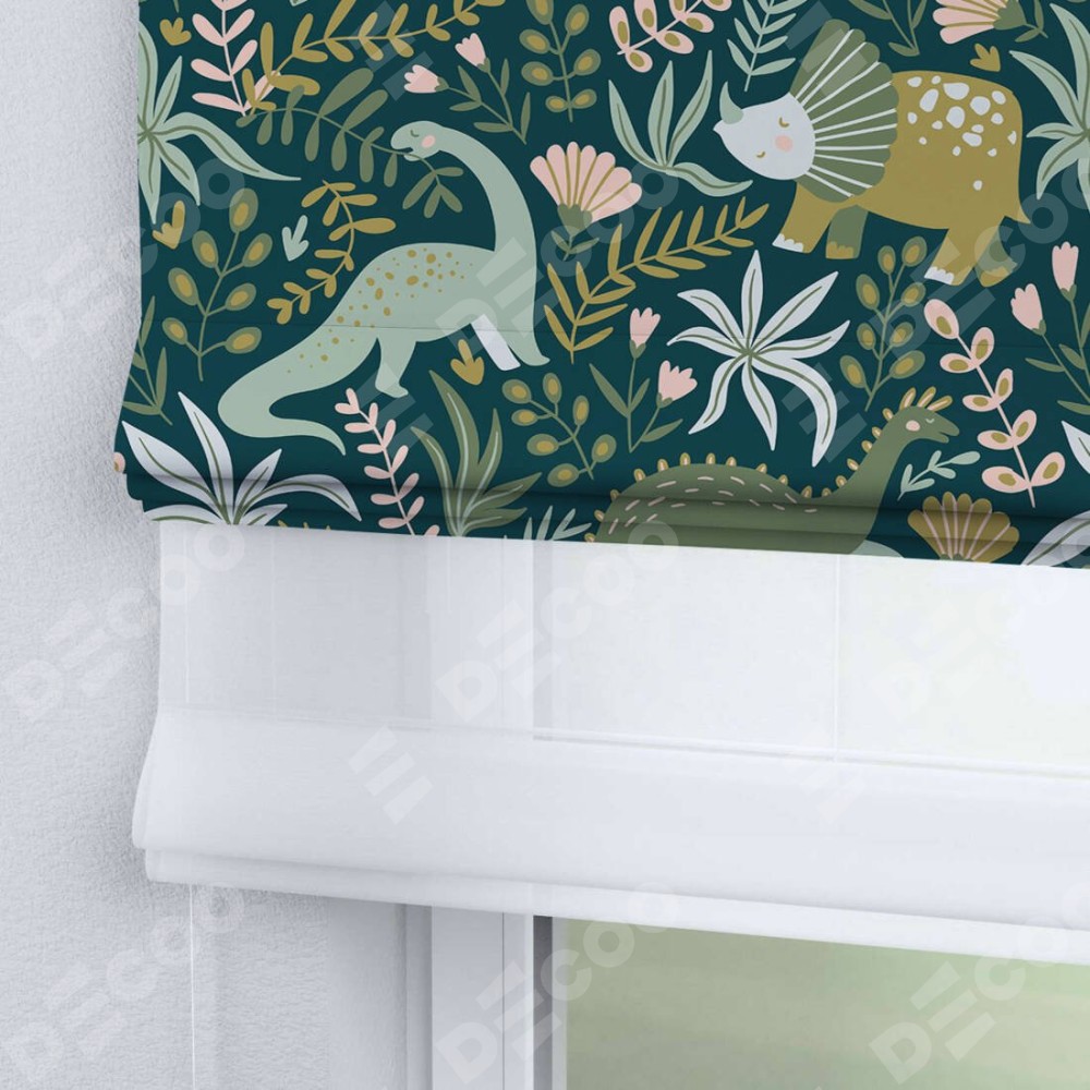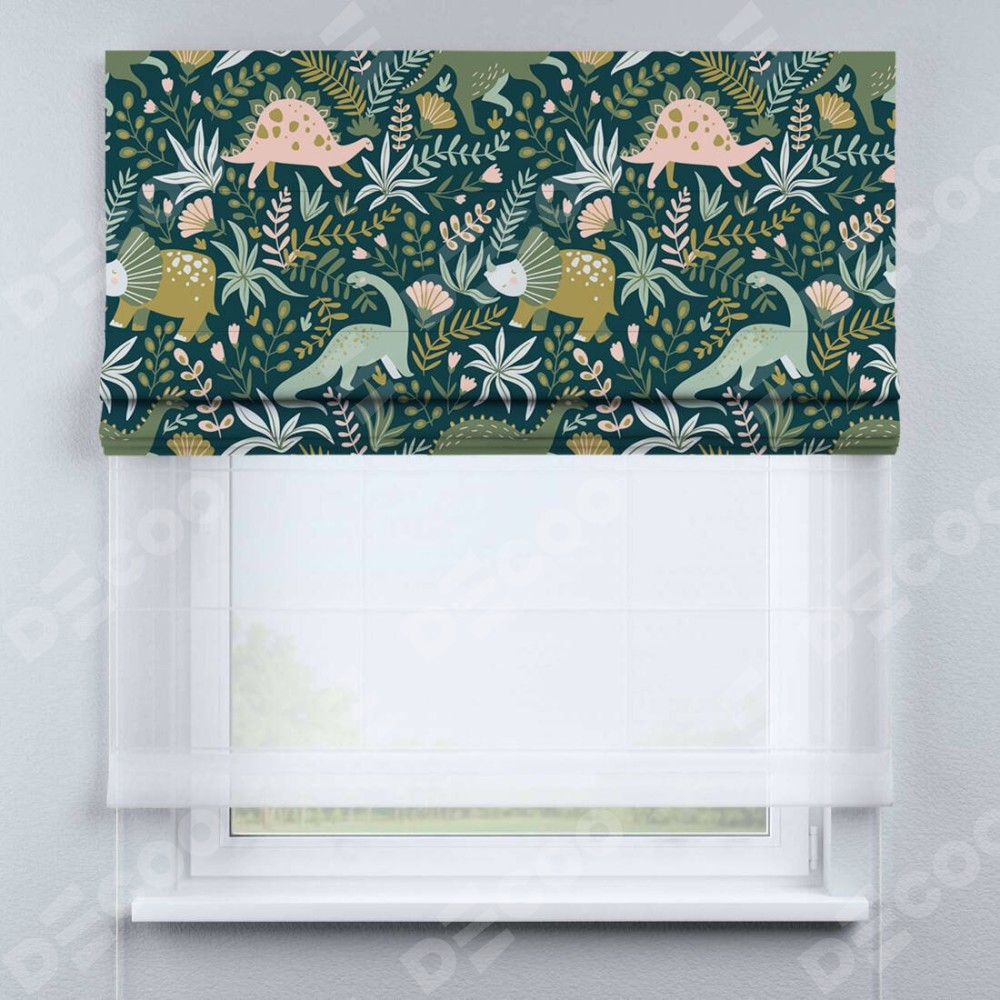 Римская штора день-ночь производителя «Cortin», используется для проёма, пошита из двух полотен, с лицевой блэкаут с нанесением сублимационной печати «Удивительный дино», вторая ткань тюль (по стандарту комплектуется тюль белого цвета артикул V-01). Имеет универсальный механизм и подходит для монтажа: на потолок, на стену и в нишу.