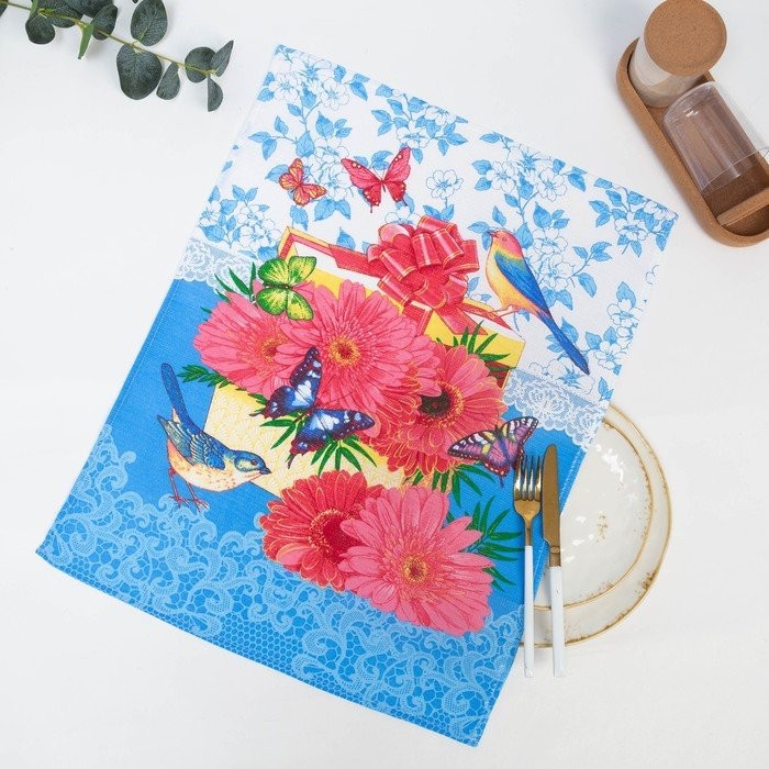 Полотенце 45×60 см, Герберы, голубой, вафля, 160 гр/м2, хлопок 100%