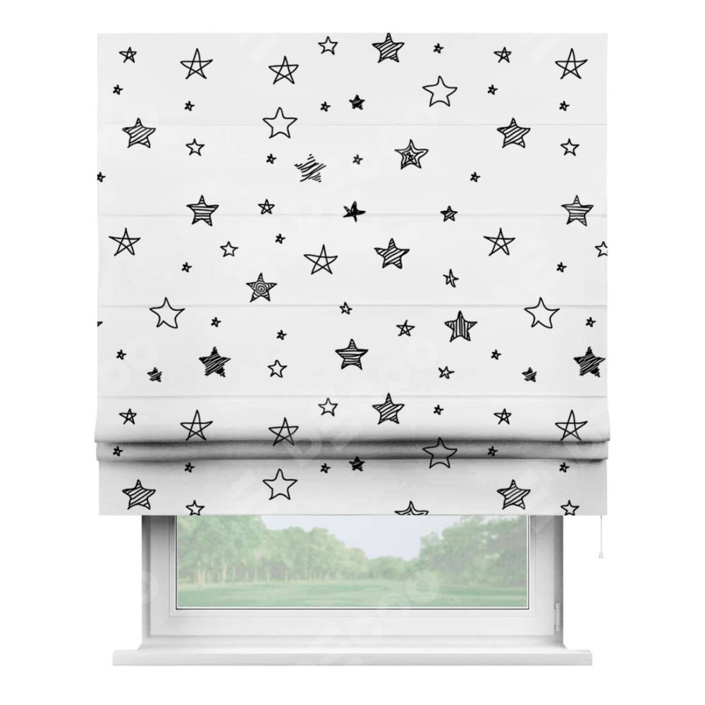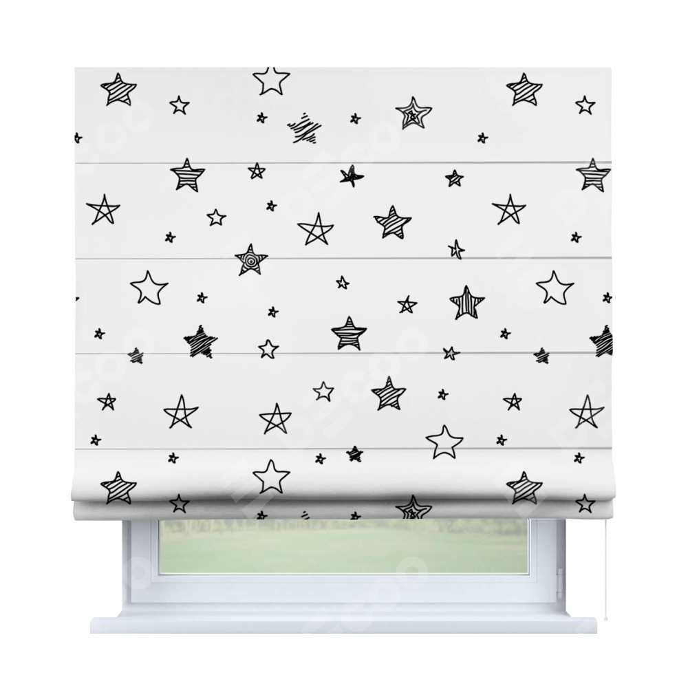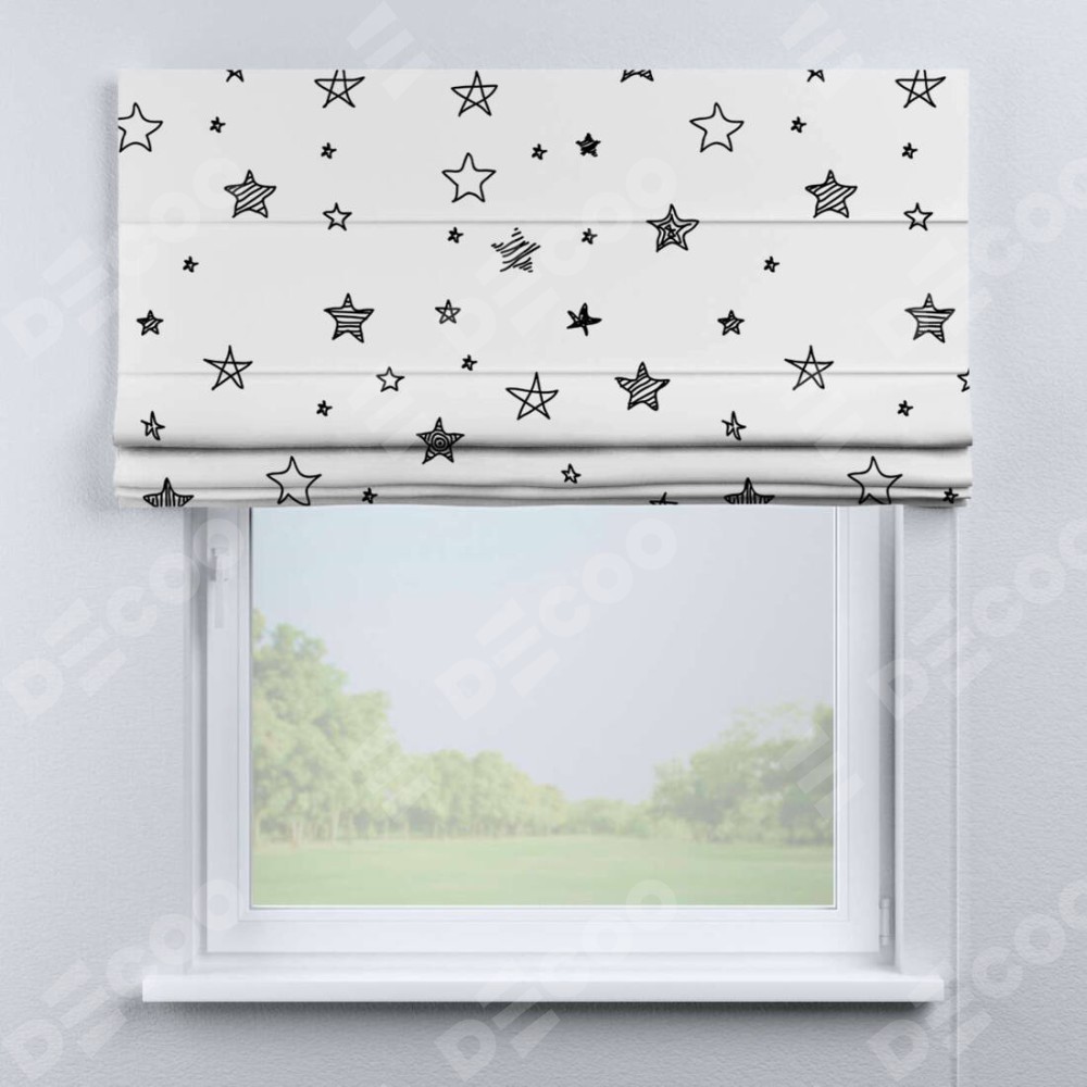 Римская штора производителя «Cortin», используется для проёма, пошита из ткани блэкаут с нанесением сублимационной печати «Звёзды». Имеет универсальный механизм и подходит для монтажа: на потолок, на стену и в нишу.