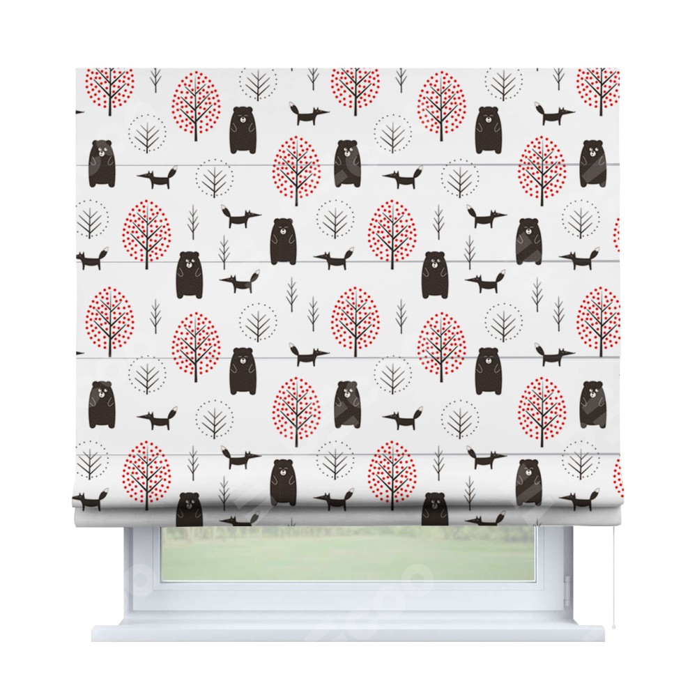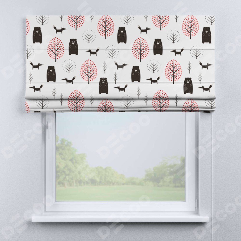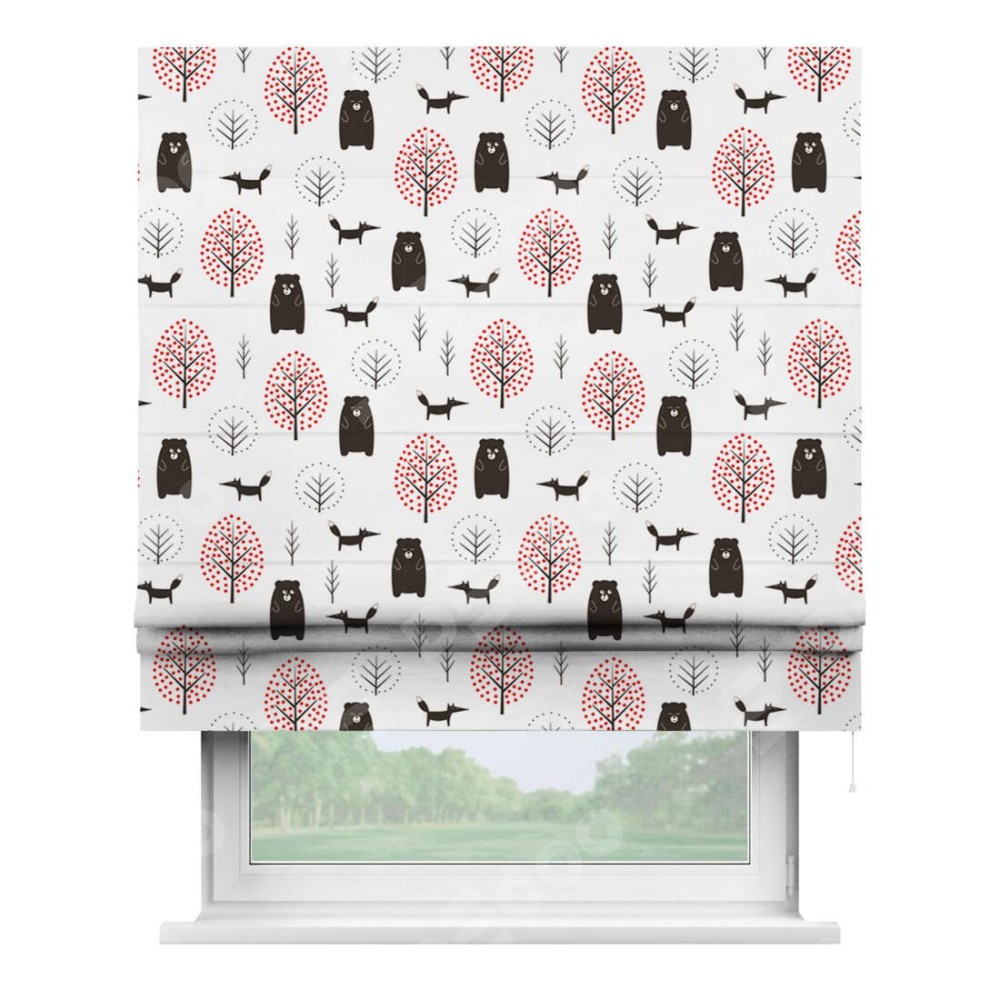 Римская штора производителя «Cortin», используется для проёма, пошита из ткани блэкаут с нанесением сублимационной печати «Сканди лес». Имеет универсальный механизм и подходит для монтажа: на потолок, на стену и в нишу.
