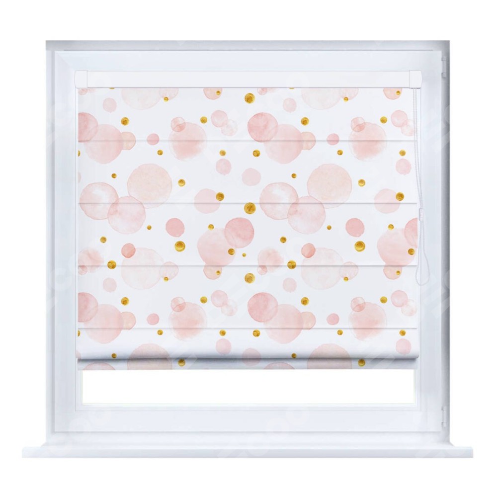 Римская штора производителя «Cortin», устанавливается на створку окна, пошита из ткани блэкаут с нанесением сублимационной печати «Круги и точки». Штора шьётся по индивидуальным размерам, для данного типа римской шторы возможная ширина от 35 до 150 см., высота до 250 см.