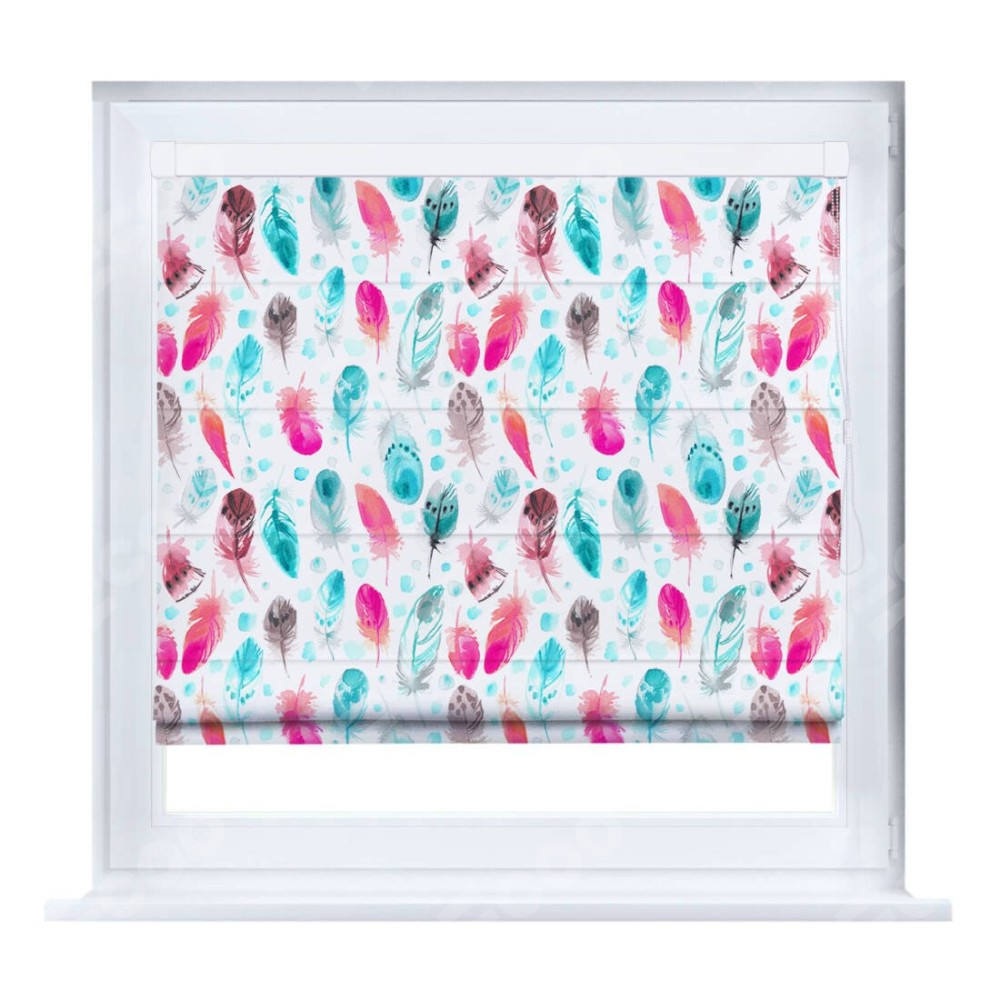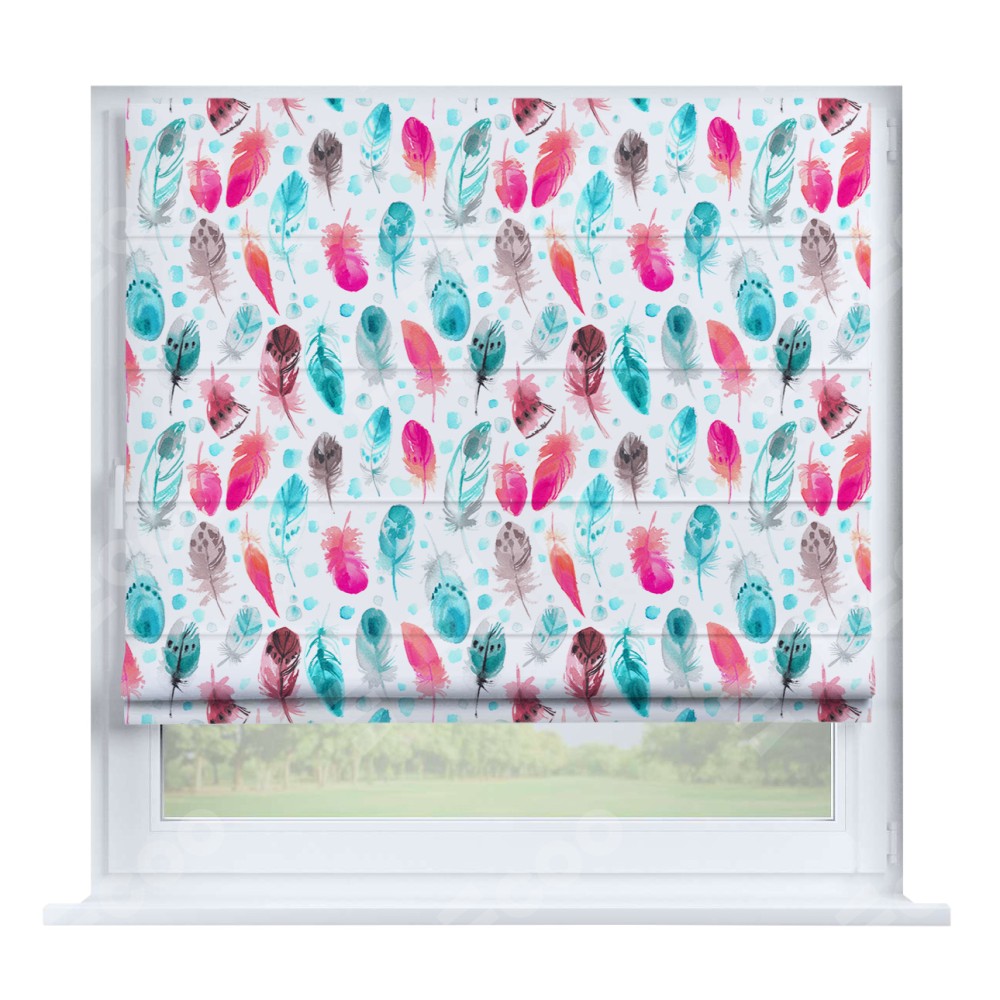 Римская штора производителя «Cortin», устанавливается на створку окна, пошита из ткани блэкаут с нанесением сублимационной печати «Перья». Штора шьётся по индивидуальным размерам, для данного типа римской шторы возможная ширина от 35 до 150 см., высота до 250 см.