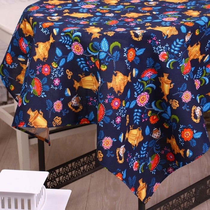 Скатерть 150×150 см Самовары, синий, хл 100%, рогожка