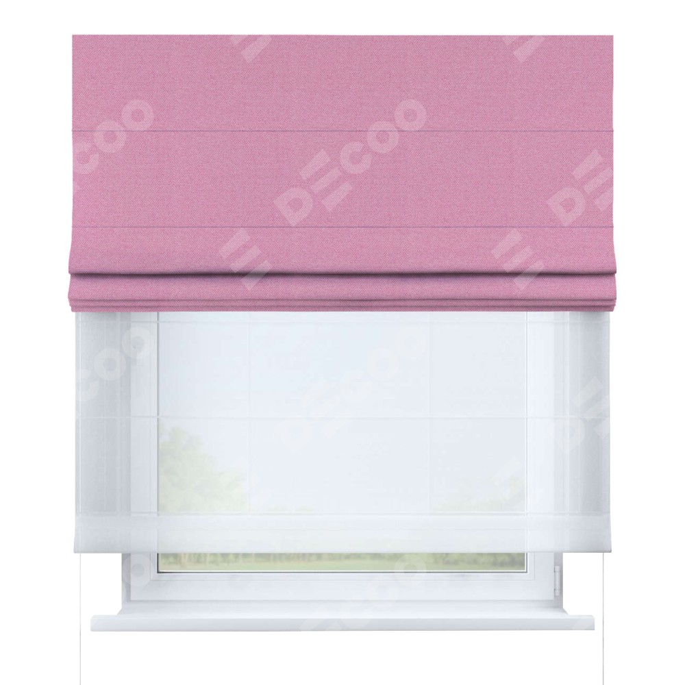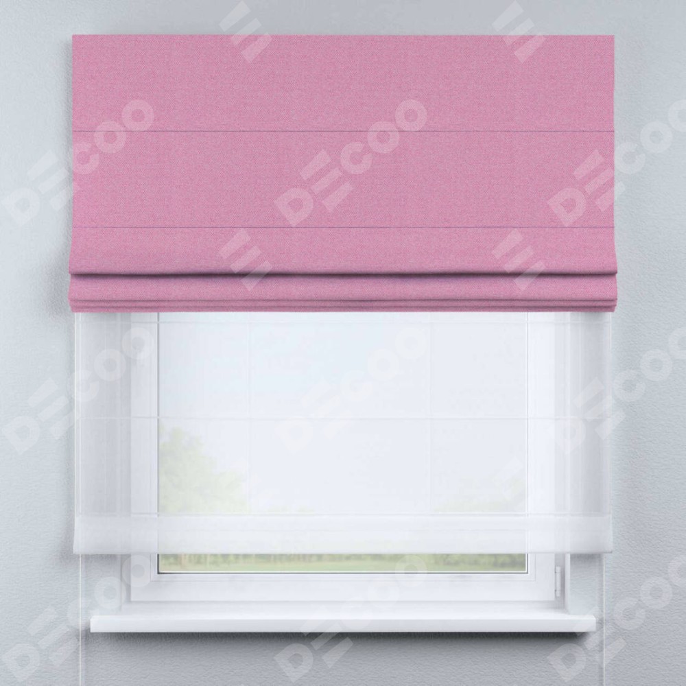 Римская штора день-ночь производителя «Cortin», используется для проёма, пошита из двух полотен, с лицевой стороны лён димаут розовый артикул 16257, вторая ткань тюль (по стандарту комплектуется тюль белого цвета артикул V-01). Имеет универсальный механизм и подходит для монтажа: на потолок, на стену и в нишу.