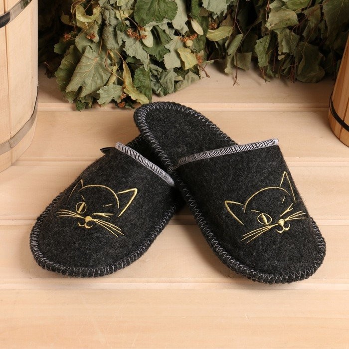 Тапочки для бани серые с вышивкой «Кошечка» женские (26 см внутр. стелька)