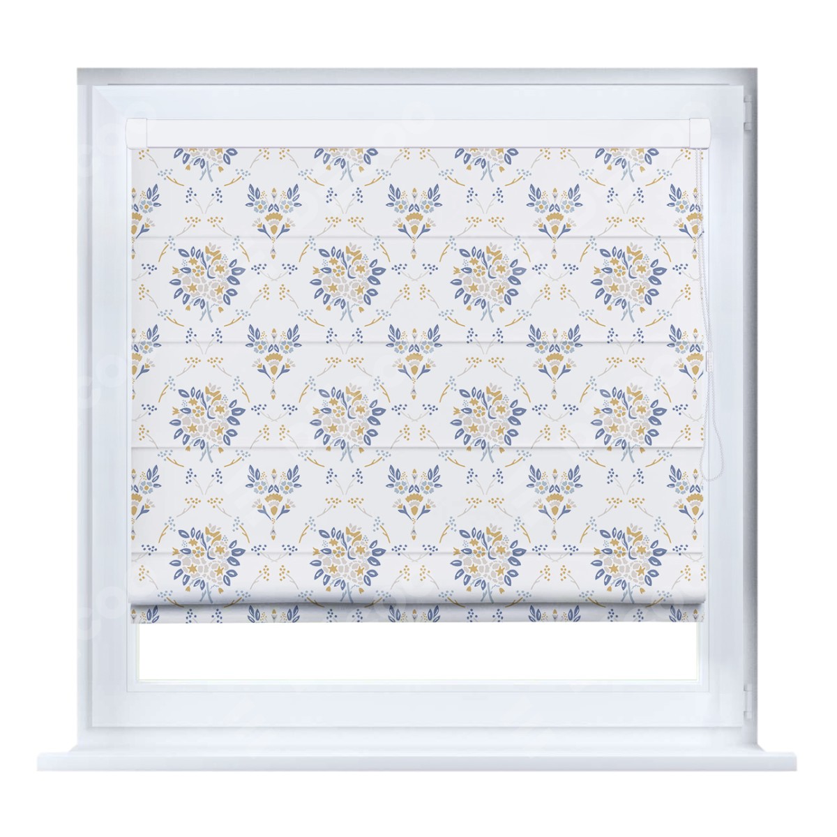 Римская штора кассетного типа, производителя «Cortin», устанавливается только на пластиковые окна и прилегает к стеклопакету, пошита из ткани блэкаут с нанесением сублимационной печати «Французский цветок».