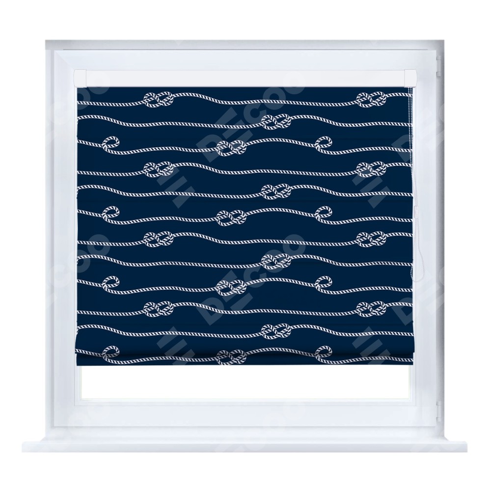 Римская штора кассетного типа, производителя «Cortin», устанавливается только на пластиковые окна и прилегает к стеклопакету, пошита из ткани блэкаут с нанесением сублимационной печати «Морской узел».