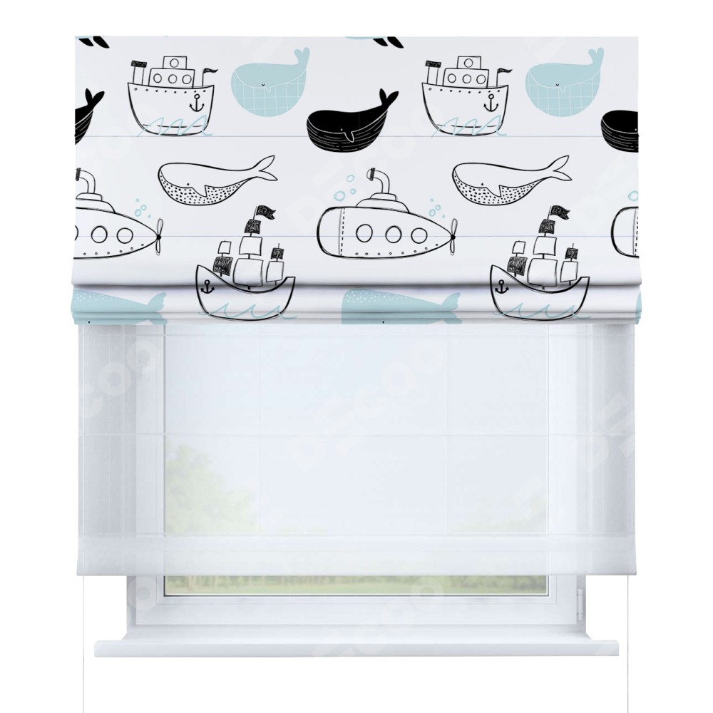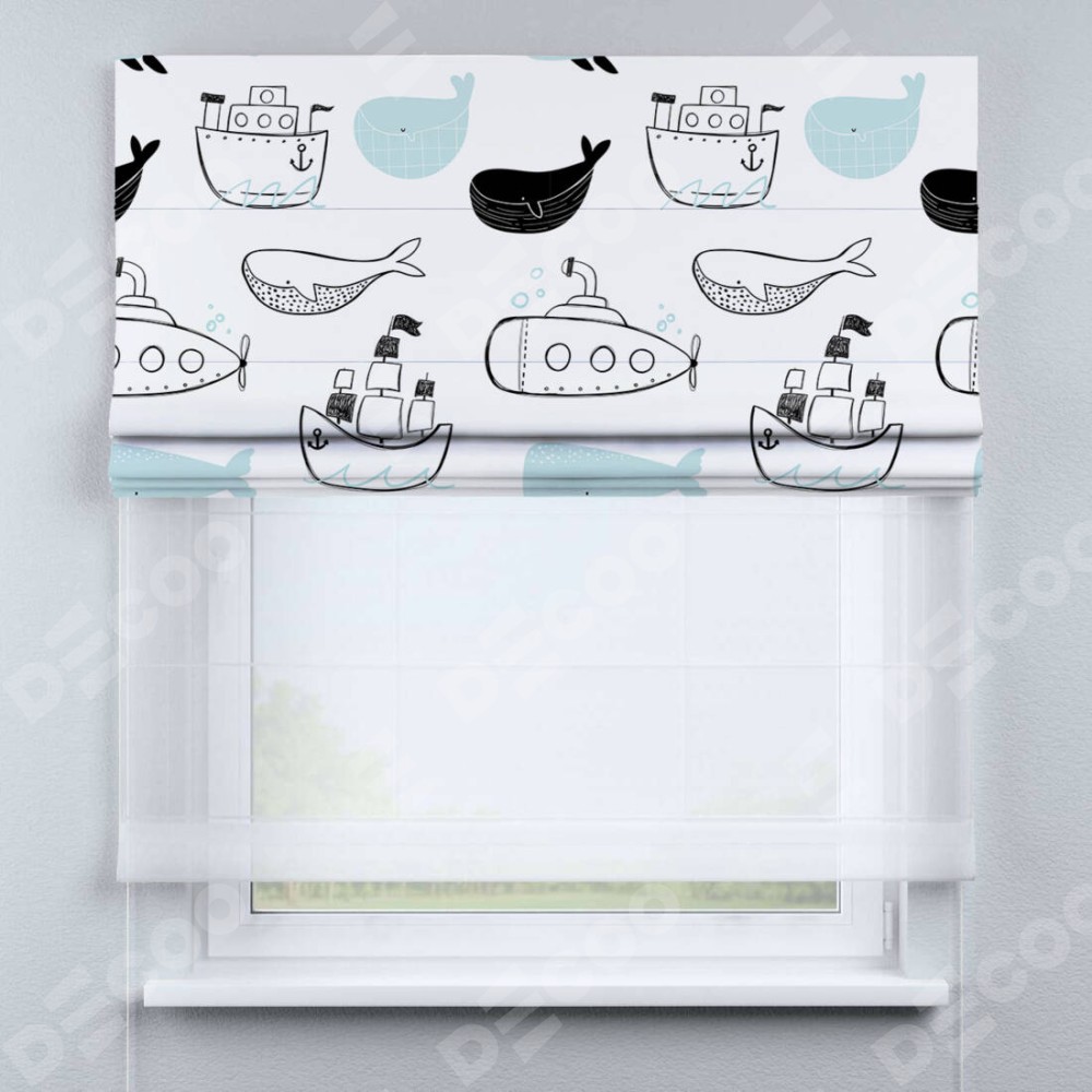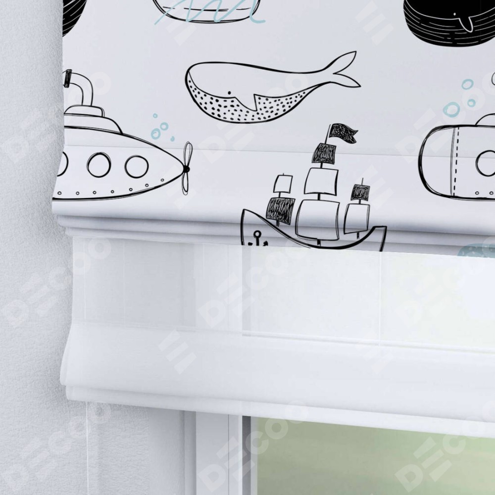 Римская штора день-ночь производителя «Cortin», используется для проёма, пошита из двух полотен, с лицевой блэкаут с нанесением сублимационной печати «Морская прогулка», вторая ткань тюль (по стандарту комплектуется тюль белого цвета артикул V-01). Имеет универсальный механизм и подходит для монтажа: на потолок, на стену и в нишу.