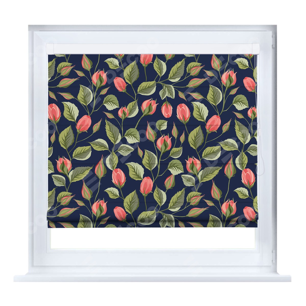Римская штора кассетного типа, производителя «Cortin», устанавливается только на пластиковые окна и прилегает к стеклопакету, пошита из ткани блэкаут с нанесением сублимационной печати «Красная роза».