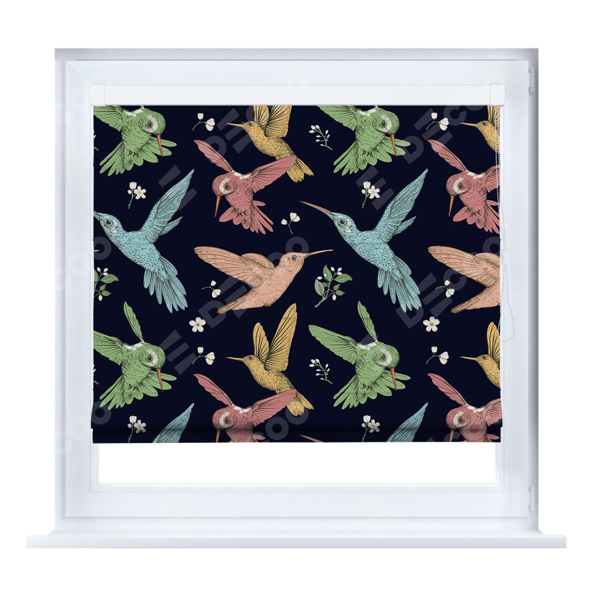 Римская штора кассетного типа, производителя «Cortin», устанавливается только на пластиковые окна и прилегает к стеклопакету, пошита из ткани блэкаут с нанесением сублимационной печати «Птицы и цветы».