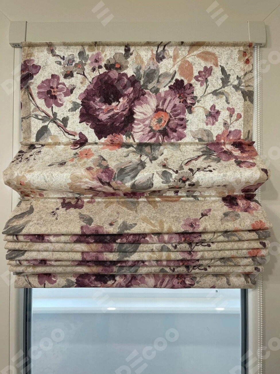 Римская штора производителя «Cortin», устанавливается на створку окна, пошита из ткани «Пионы». Штора шьётся по индивидуальным размерам, для данного типа римской шторы возможная ширина от 35 до 150 см., высота до 250 см.