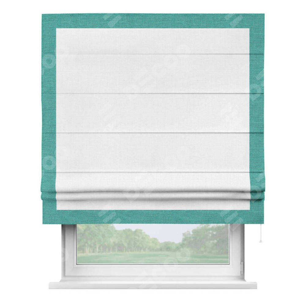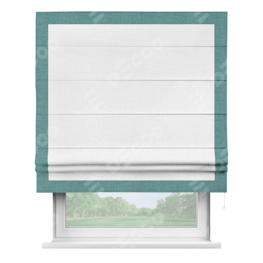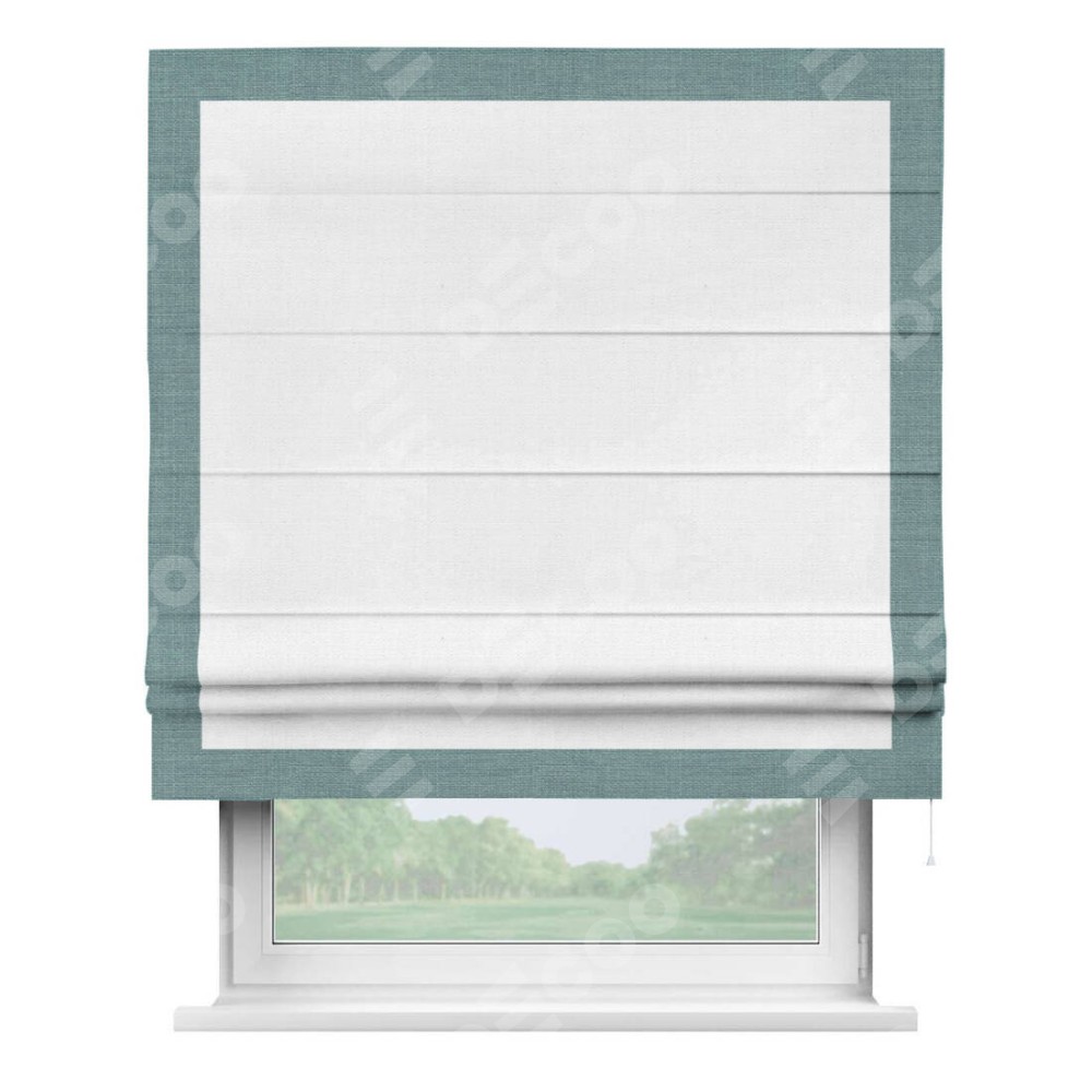 Римская штора производителя «Cortin», используется для проёма, пошита из ткани лён белый, артикул 53430. Отделка шторы кантом «Чесс», ткань для канта используется из льна разной расцветки на выбор. Имеет универсальный механизм и подходит для монтажа: на потолок, на стену и в нишу.
