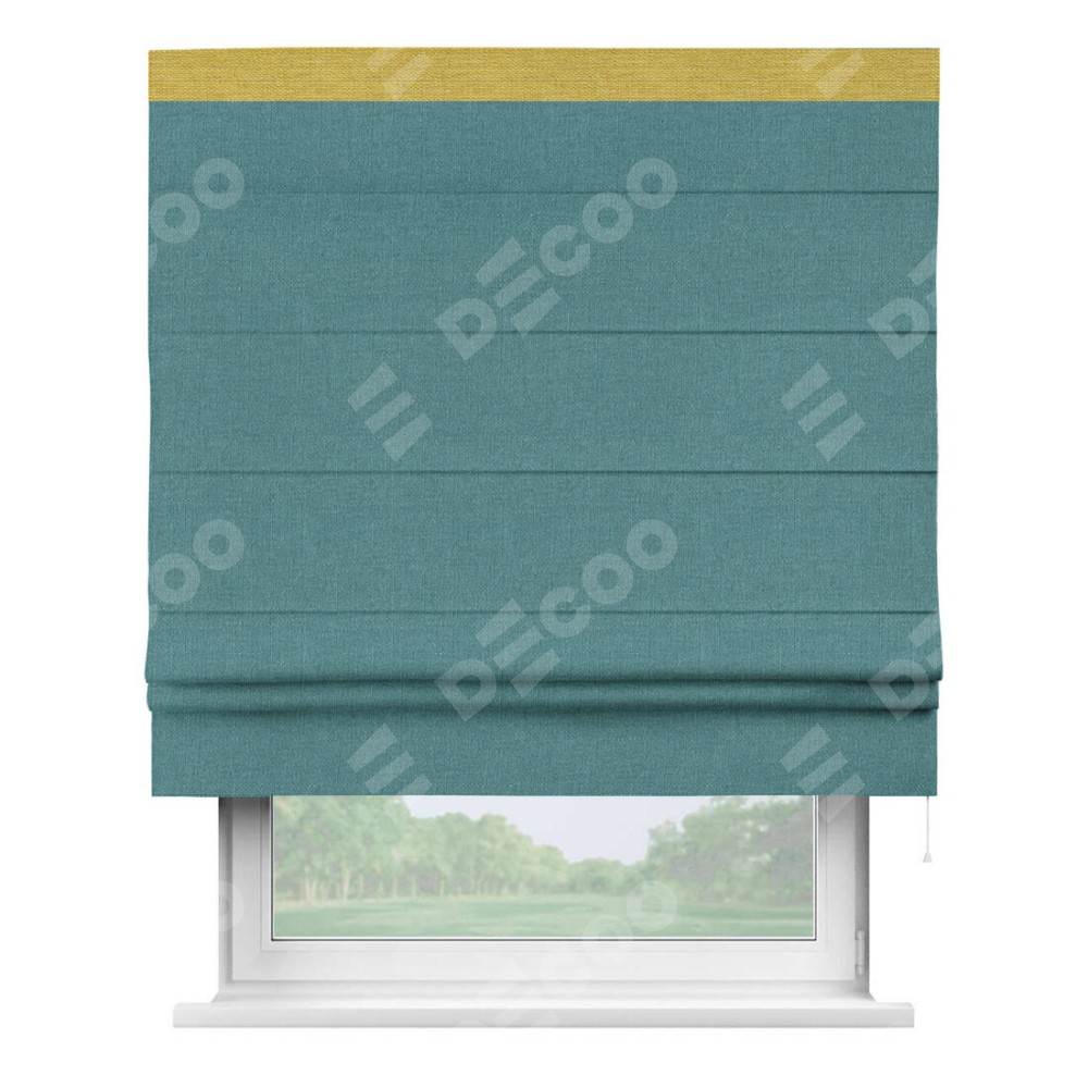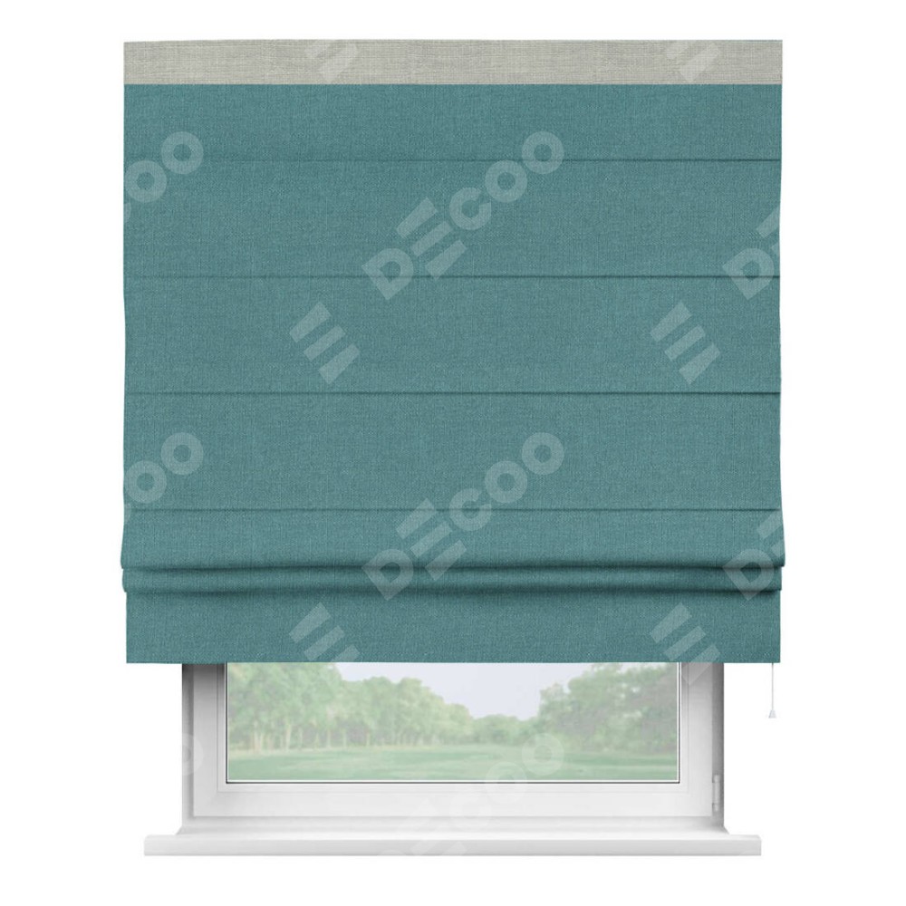 Римская штора производителя «Cortin», используется для проёма, пошита из ткани лён бирюзовый, артикул 53436. Отделка шторы кантом «Кинг», ткань для канта используется из льна разной расцветки на выбор. Имеет универсальный механизм и подходит для монтажа: на потолок, на стену и в нишу.