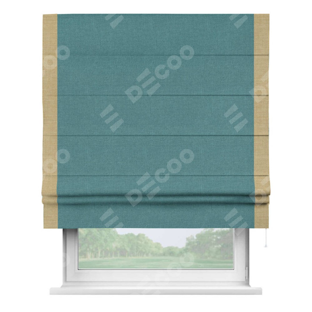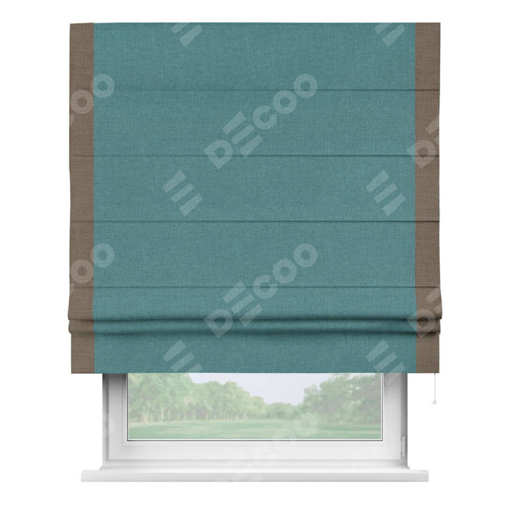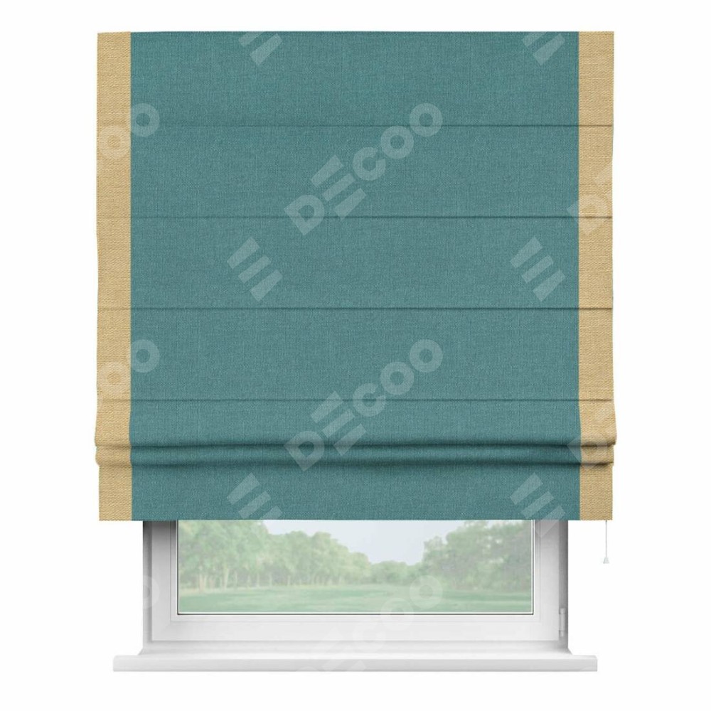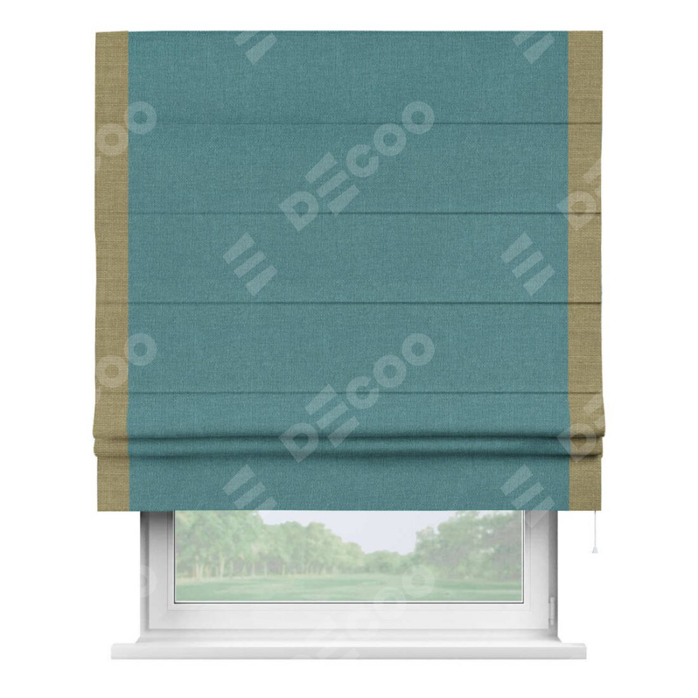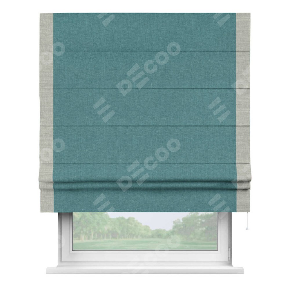 Римская штора производителя «Cortin», используется для проёма, пошита из ткани лён бирюзовый, артикул 53436. Отделка шторы кантом «Стрим Дуо», ткань для канта используется из льна разной расцветки на выбор. Имеет универсальный механизм и подходит для монтажа: на потолок, на стену и в нишу.