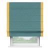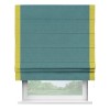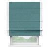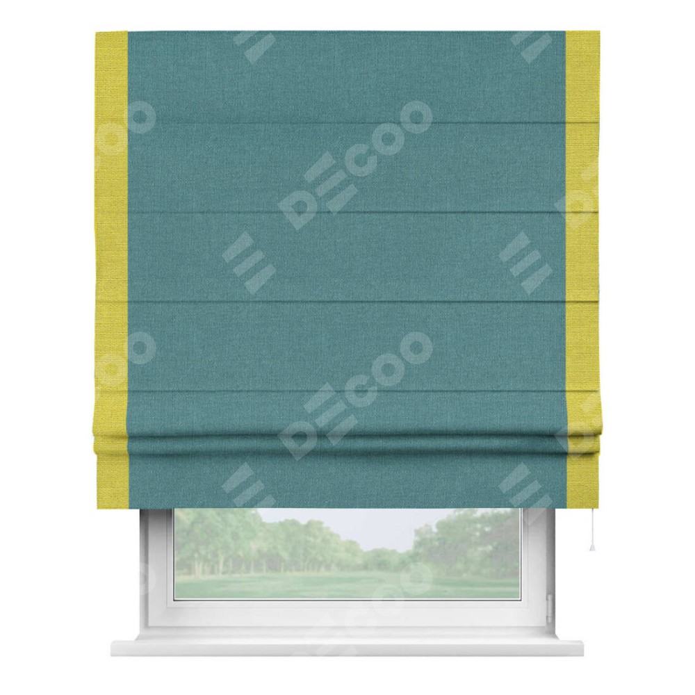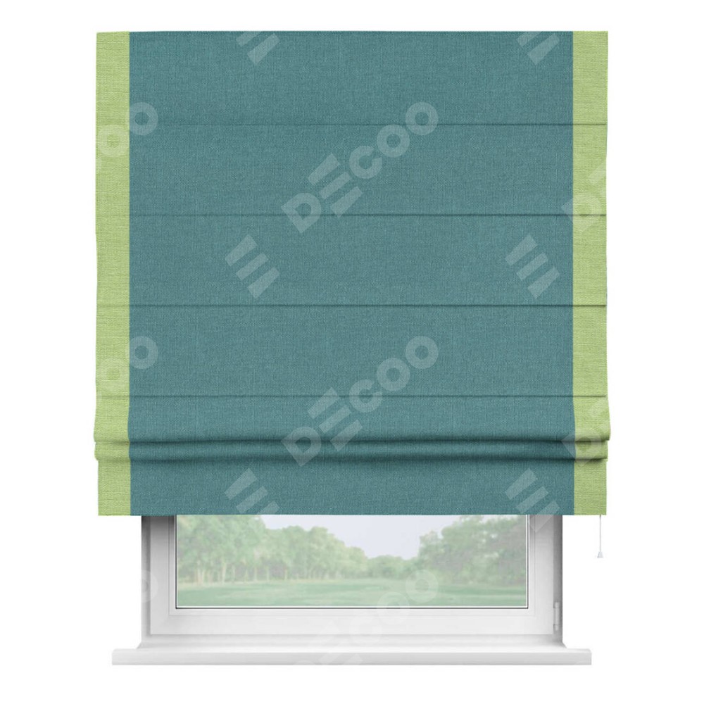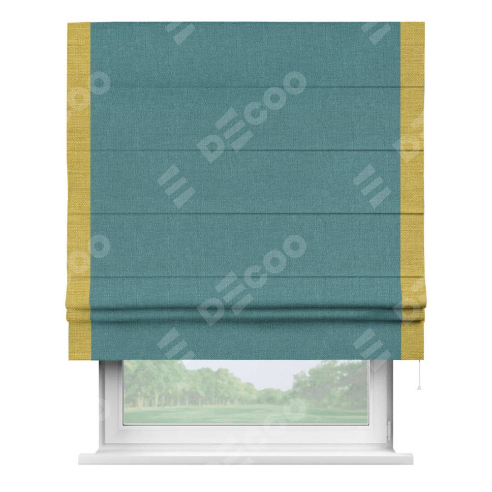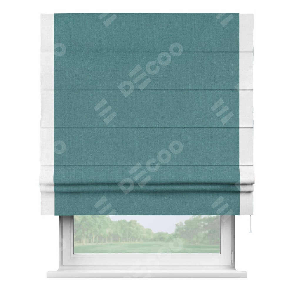 Римская штора производителя «Cortin», используется для проёма, пошита из ткани лён бирюзовый, артикул 53436. Отделка шторы кантом «Стрим Дуо», ткань для канта используется из льна разной расцветки на выбор. Имеет универсальный механизм и подходит для монтажа: на потолок, на стену и в нишу.