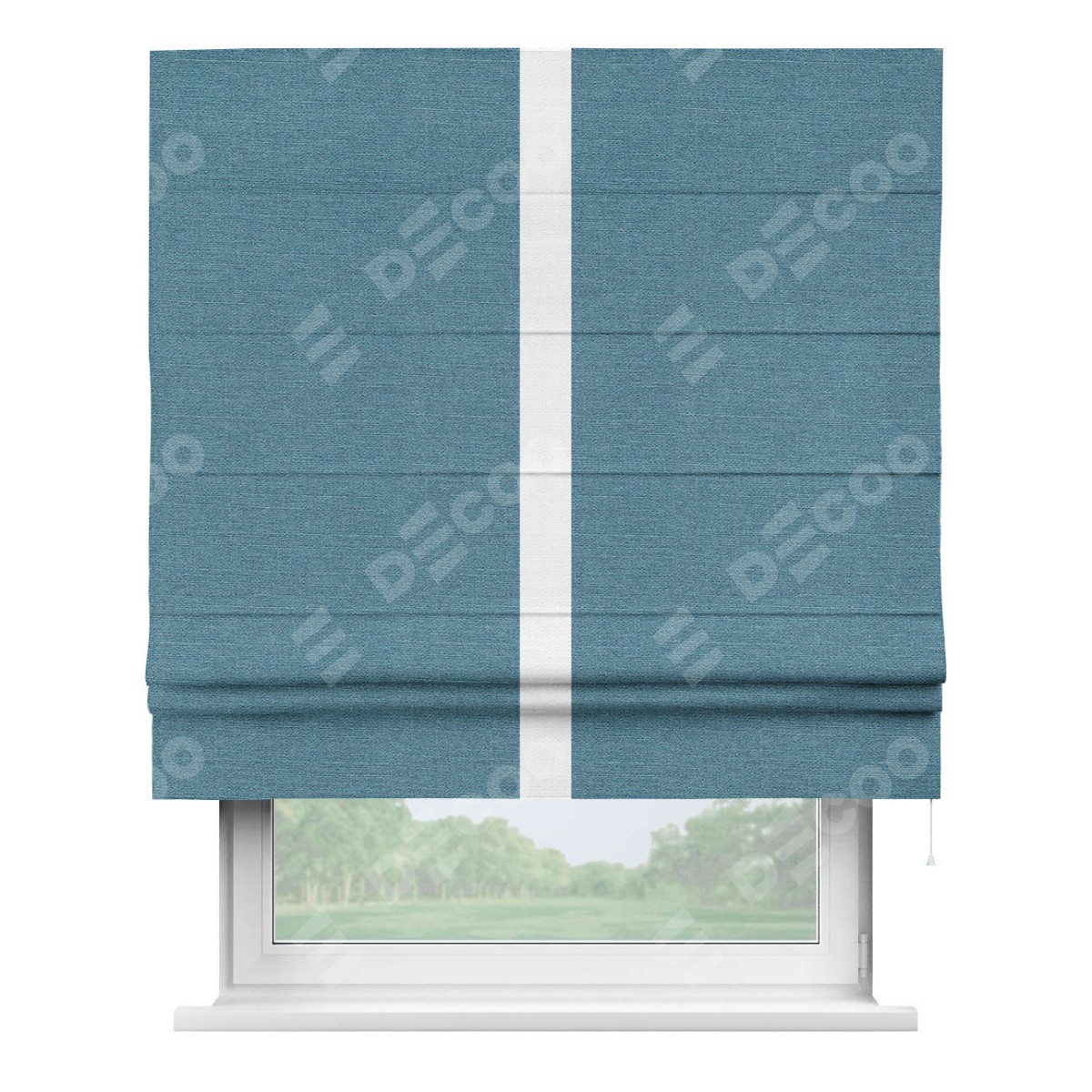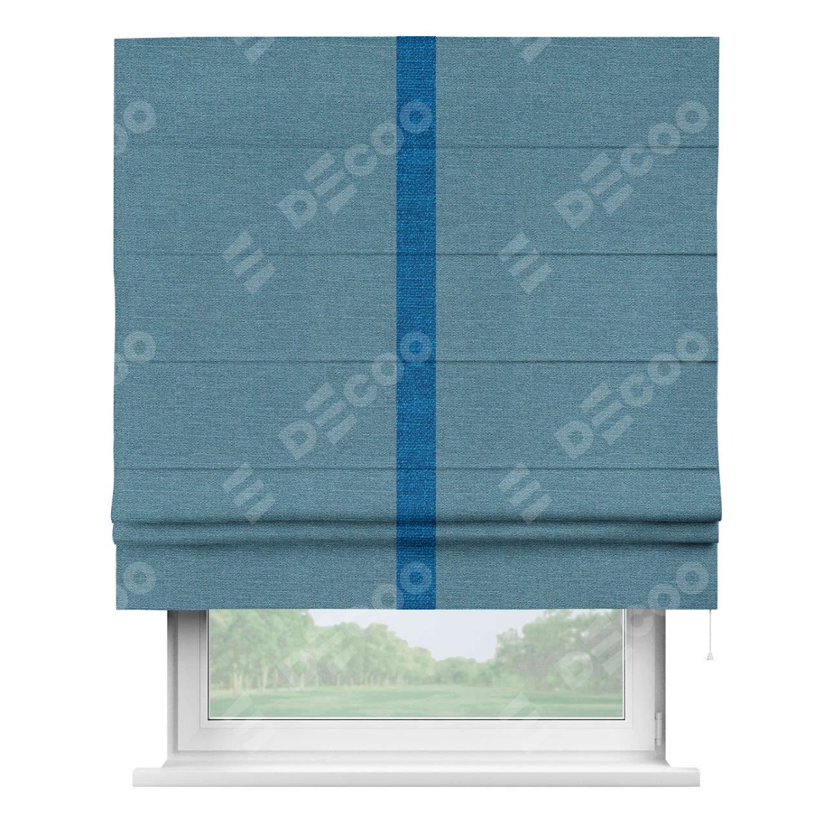 Римская штора производителя «Cortin», используется для проёма, пошита из ткани лён голубой, артикул 63741. Отделка шторы кантом «Хайвэй», ткань для канта используется из льна разной расцветки на выбор. Имеет универсальный механизм и подходит для монтажа: на потолок, на стену и в нишу.