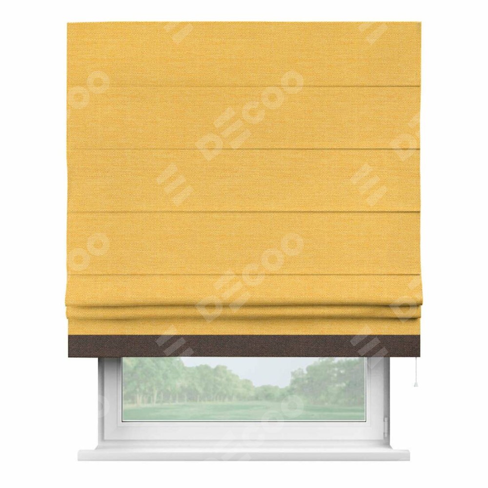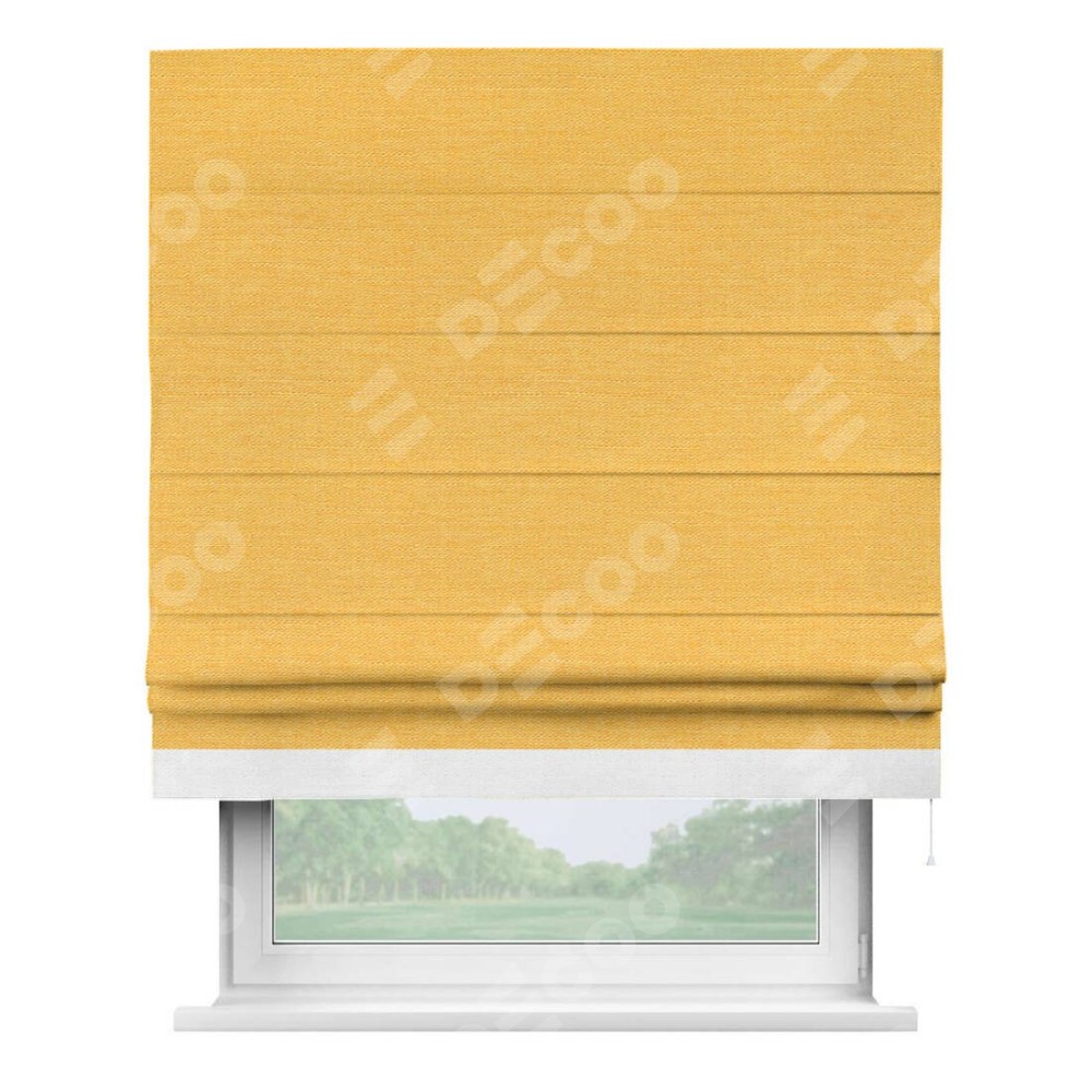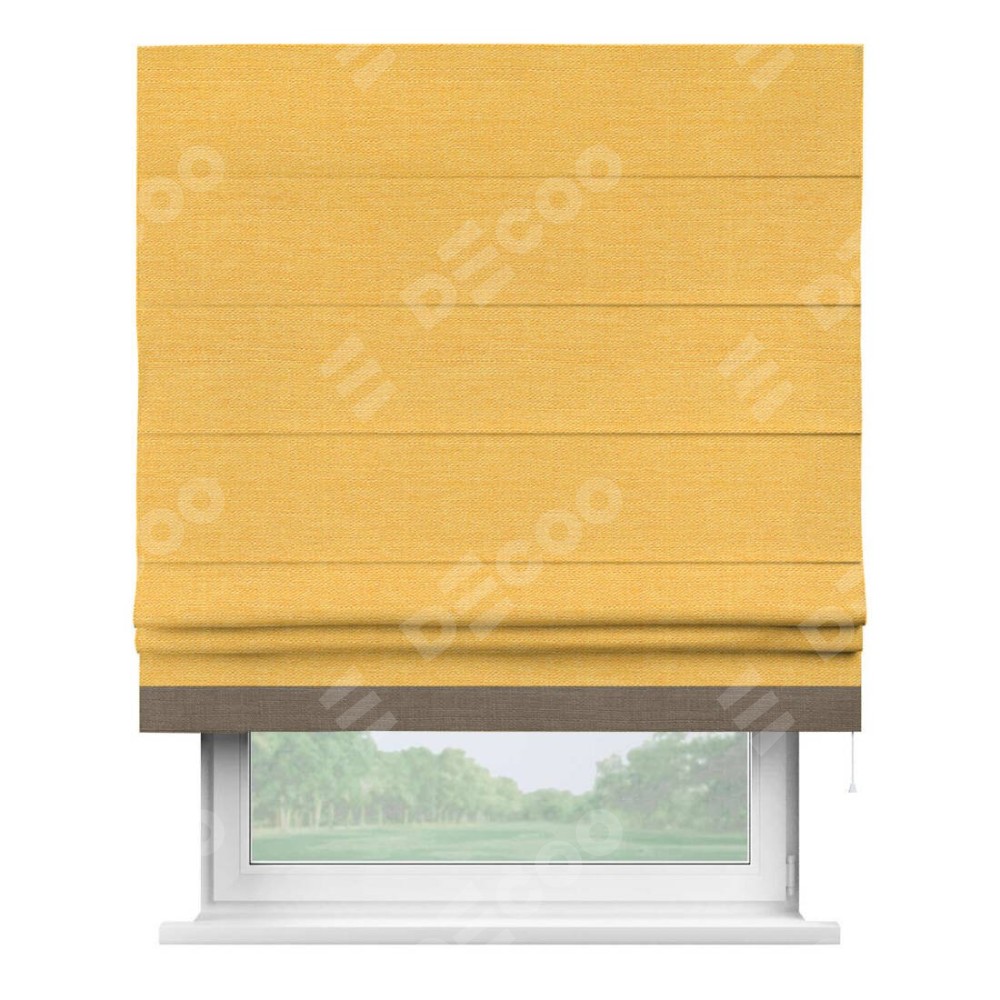 Римская штора производителя «Cortin», используется для проёма, пошита из ткани лён желтый, артикул 63738. Отделка шторы кантом «Джестер», ткань для канта используется из льна разной расцветки на выбор. Имеет универсальный механизм и подходит для монтажа: на потолок, на стену и в нишу.