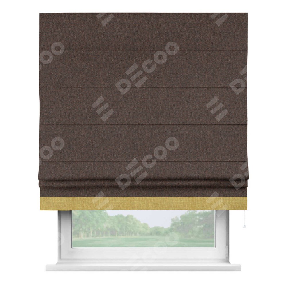 Римская штора производителя «Cortin», используется для проёма, пошита из ткани лён коричневый, артикул 53443. Отделка шторы кантом «Джестер», ткань для канта используется из льна разной расцветки на выбор. Имеет универсальный механизм и подходит для монтажа: на потолок, на стену и в нишу.