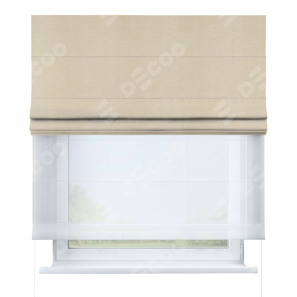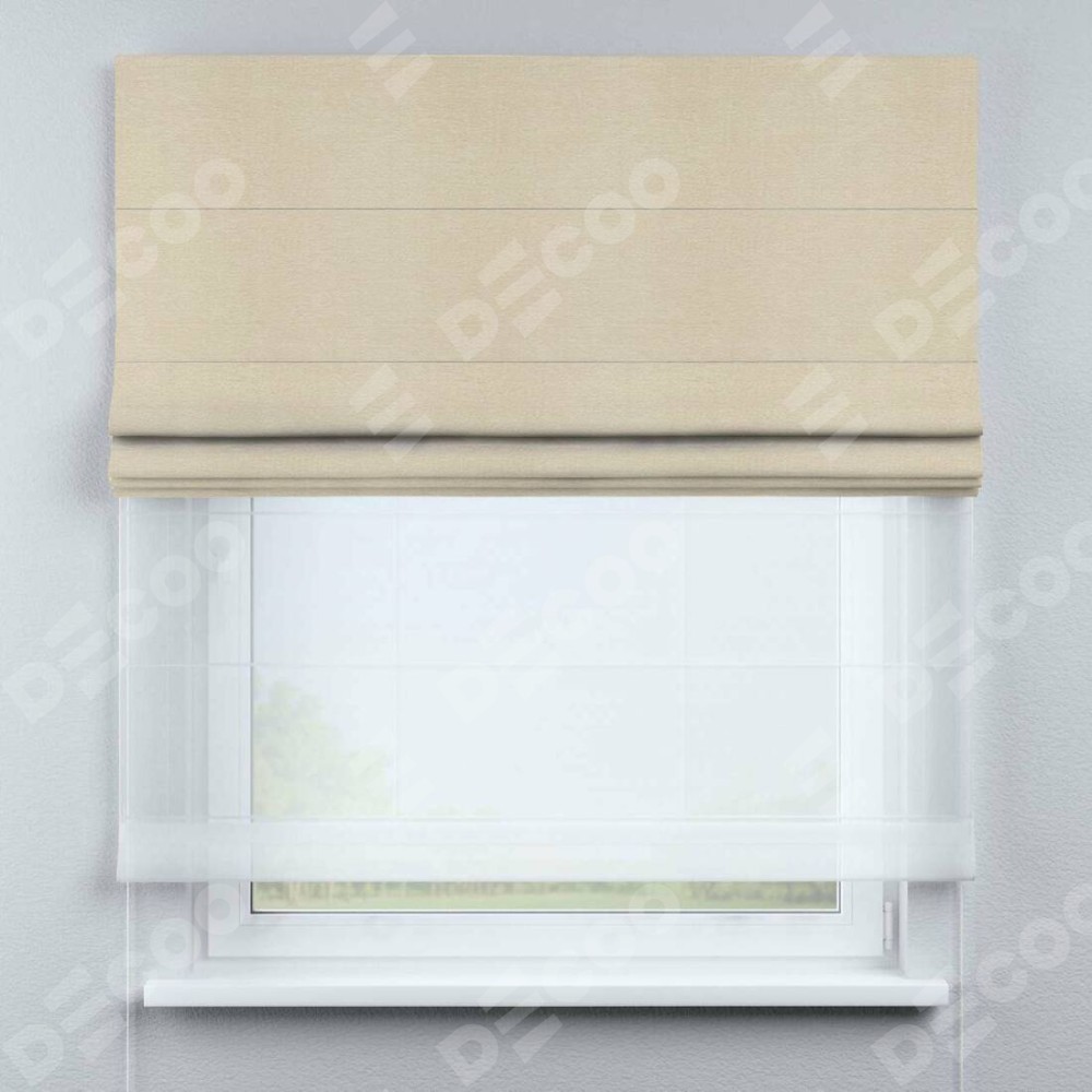 Римская штора день-ночь производителя «Cortin», используется для проёма, пошита из двух полотен, с лицевой стороны софт однотонный бежевый лайт артикул 33100, вторая ткань тюль (по стандарту комплектуется тюль белого цвета артикул V-01). Имеет универсальный механизм и подходит для монтажа: на потолок, на стену и в нишу.
