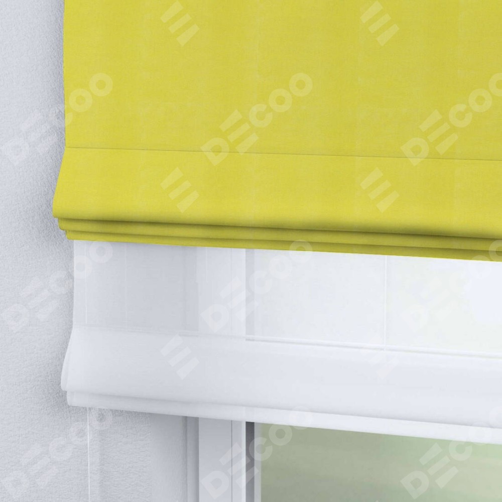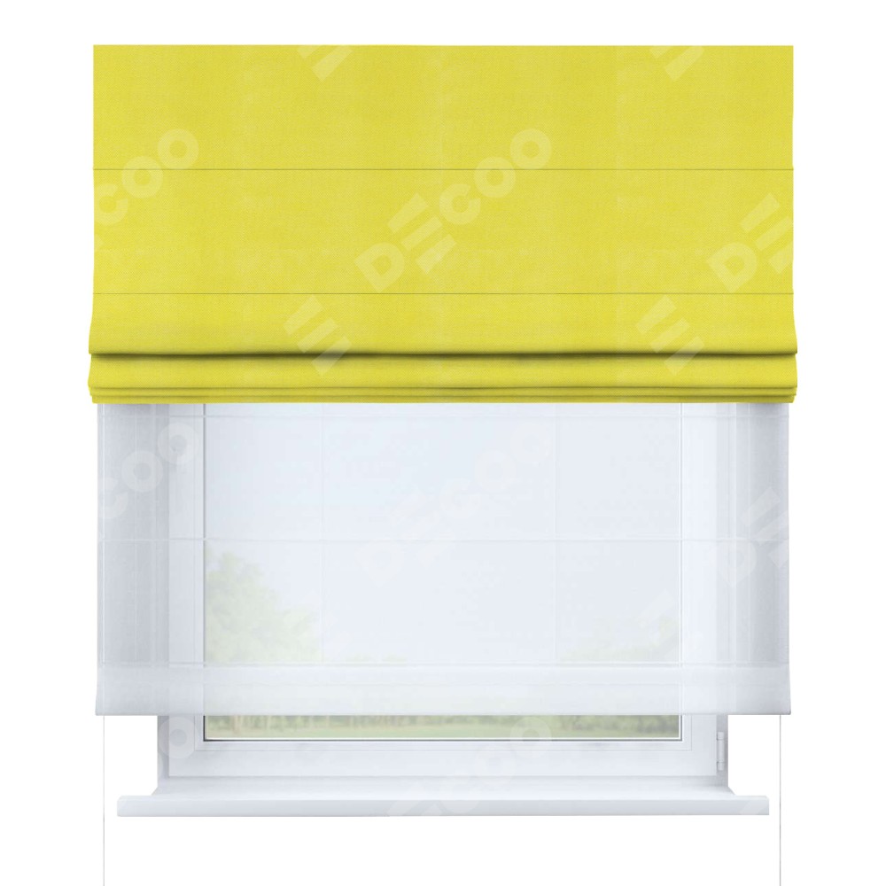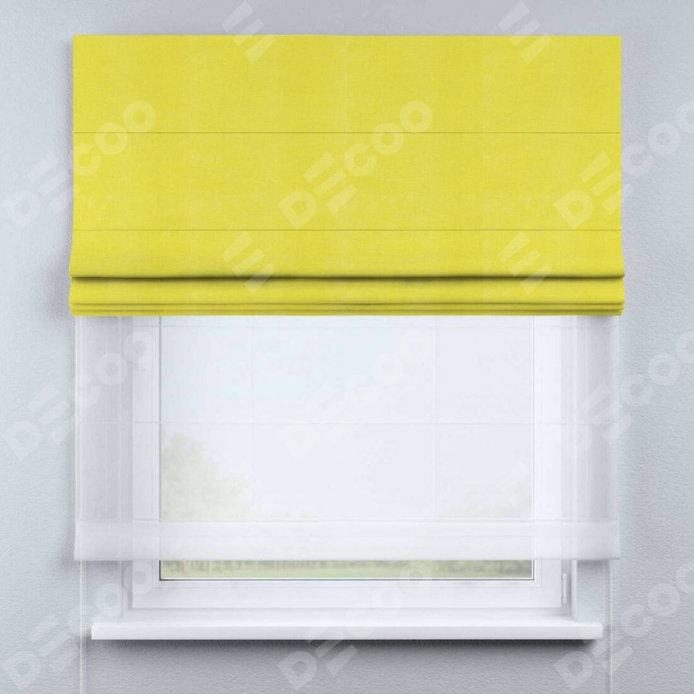 Римская штора день-ночь производителя «Cortin», используется для проёма, пошита из двух полотен, с лицевой стороны вельвет светло-желтый артикул 30997, вторая ткань тюль (по стандарту комплектуется тюль белого цвета артикул V-01). Имеет универсальный механизм и подходит для монтажа: на потолок, на стену и в нишу.