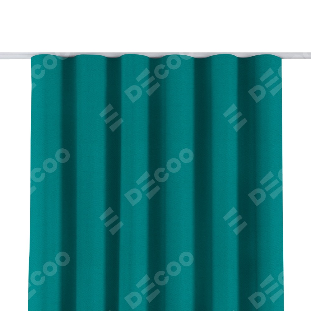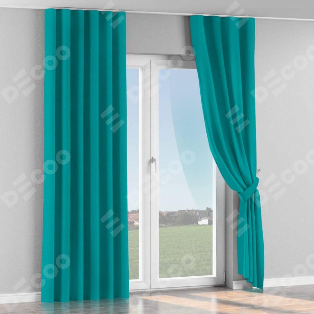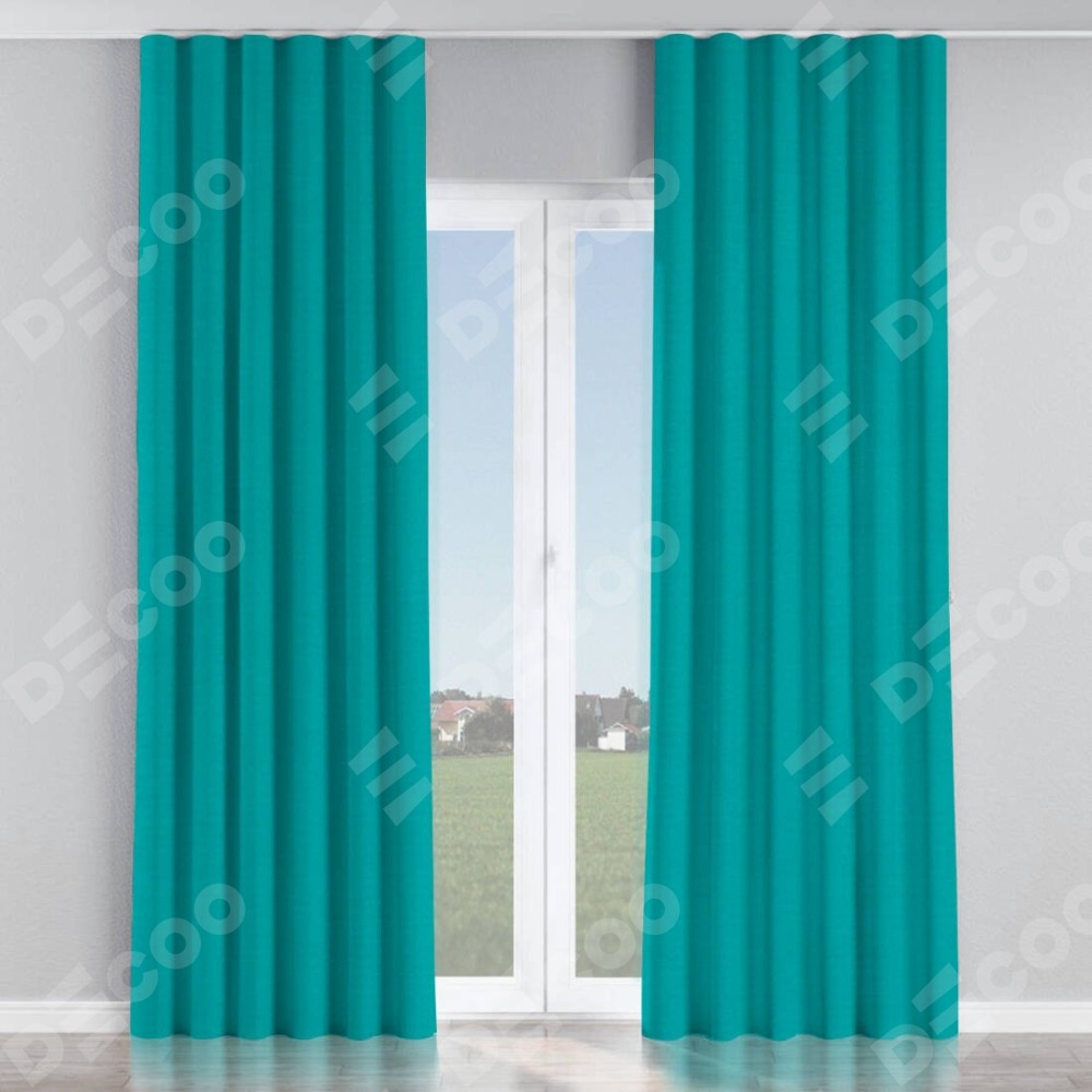 Комплект прямых штор, от производителя «Cortin», пошиты из ткани блэкаут однотонный бирюзовый, артикул ткани 88297. С изнаночной стороны в верхней части штор пристрачивается шторная лента с декоративными складками «Волна». Для создания элегантных складок прямые шторы шьются по стандарту с коэффициентом 1:2 (на 100 см. ширины проёма 200 см. ширины ткани).