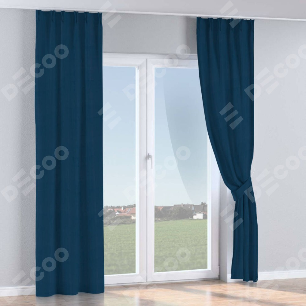 Комплект прямых штор, от производителя «Cortin», пошиты из ткани блэкаут однотонный синий, артикул ткани 29327. С изнаночной стороны в верхней части штор пристрачивается шторная лента с декоративными складками «Кустик». Для создания элегантных складок прямые шторы шьются по стандарту с коэффициентом 1:2 (на 100 см. ширины проёма 200 см. ширины ткани).