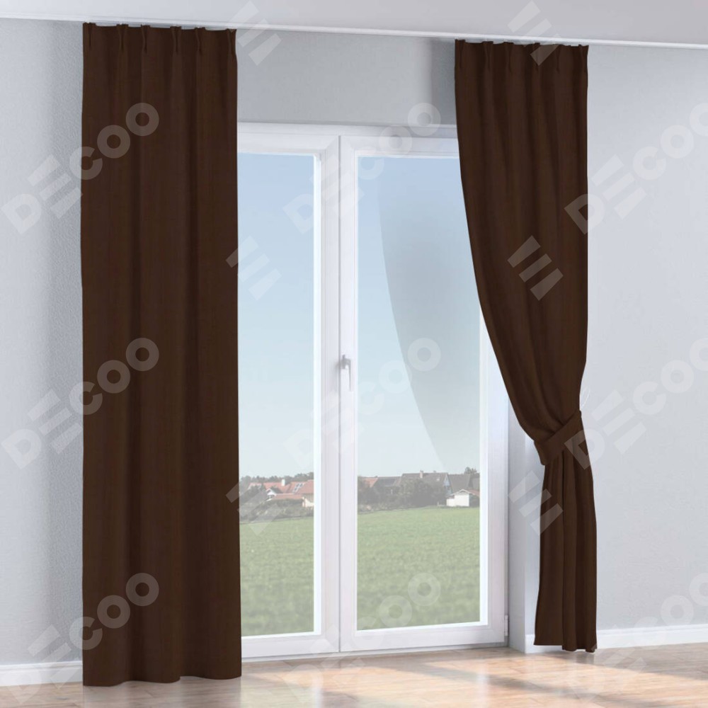 Комплект прямых штор, от производителя «Cortin», пошиты из ткани блэкаут однотонный тёмно-коричневый, артикул ткани 88287. С изнаночной стороны в верхней части штор пристрачивается шторная лента с декоративными складками «Кустик». Для создания элегантных складок прямые шторы шьются по стандарту с коэффициентом 1:2 (на 100 см. ширины проёма 200 см. ширины ткани).