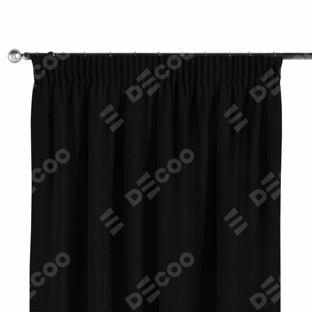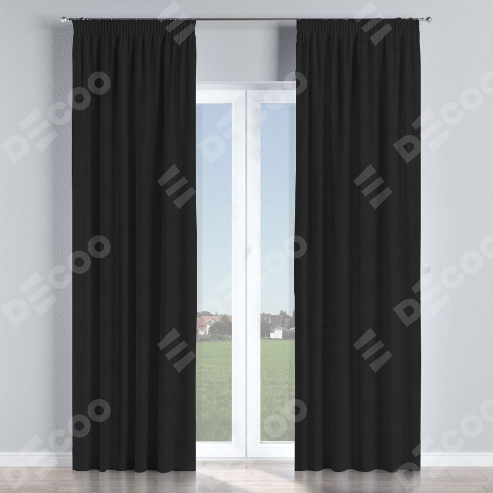 Комплект прямых штор, от производителя «Cortin», пошиты из ткани блэкаут однотонный черный, артикул ткани 79904. С изнаночной стороны в верхней части штор пристрачивается шторная лента с декоративными складками «Карандаш». Для создания элегантных складок прямые шторы шьются по стандарту с коэффициентом 1:2 (на 100 см. ширины проёма 200 см. ширины ткани).
