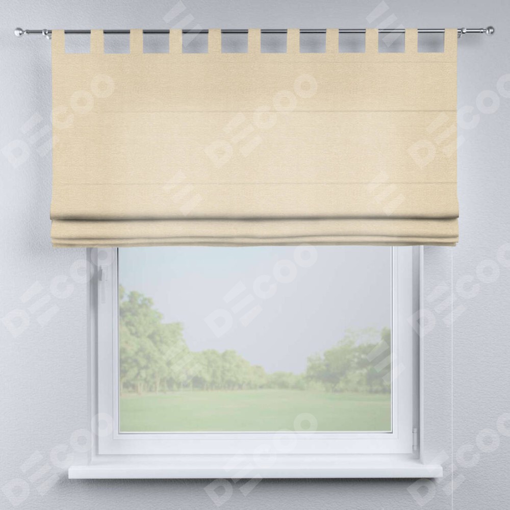 Римская штора производителя «Cortin», используется для проёма, пошита из ткани софт однотонный бежевый лайт, артикул ткани 33100. Данная модель пошита на петлях, комплектуется на выбор круглым карнизом и подходит для монтажа на стену. Римская штора на петлях имеет простую систему регулировки высоты, отличительным преимуществом данной модели является простой способ монтажа. Достаточно повесить ее на трубу и штора готова!