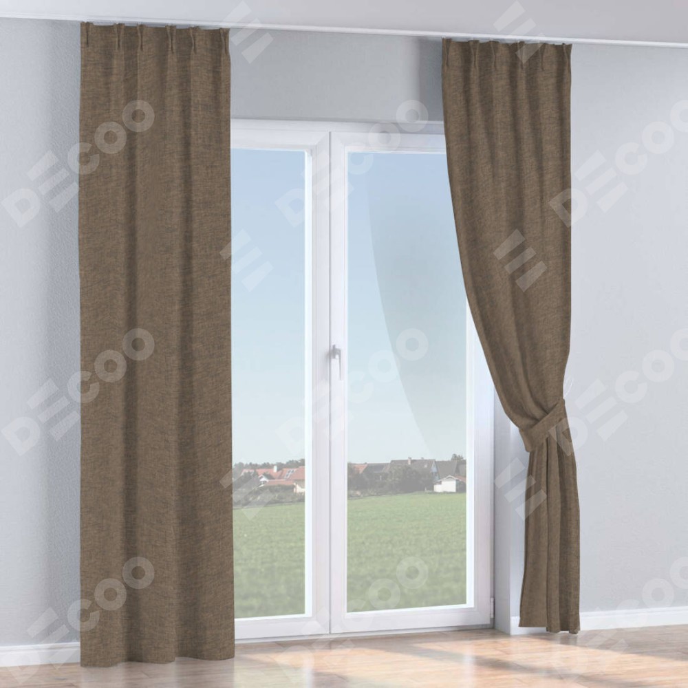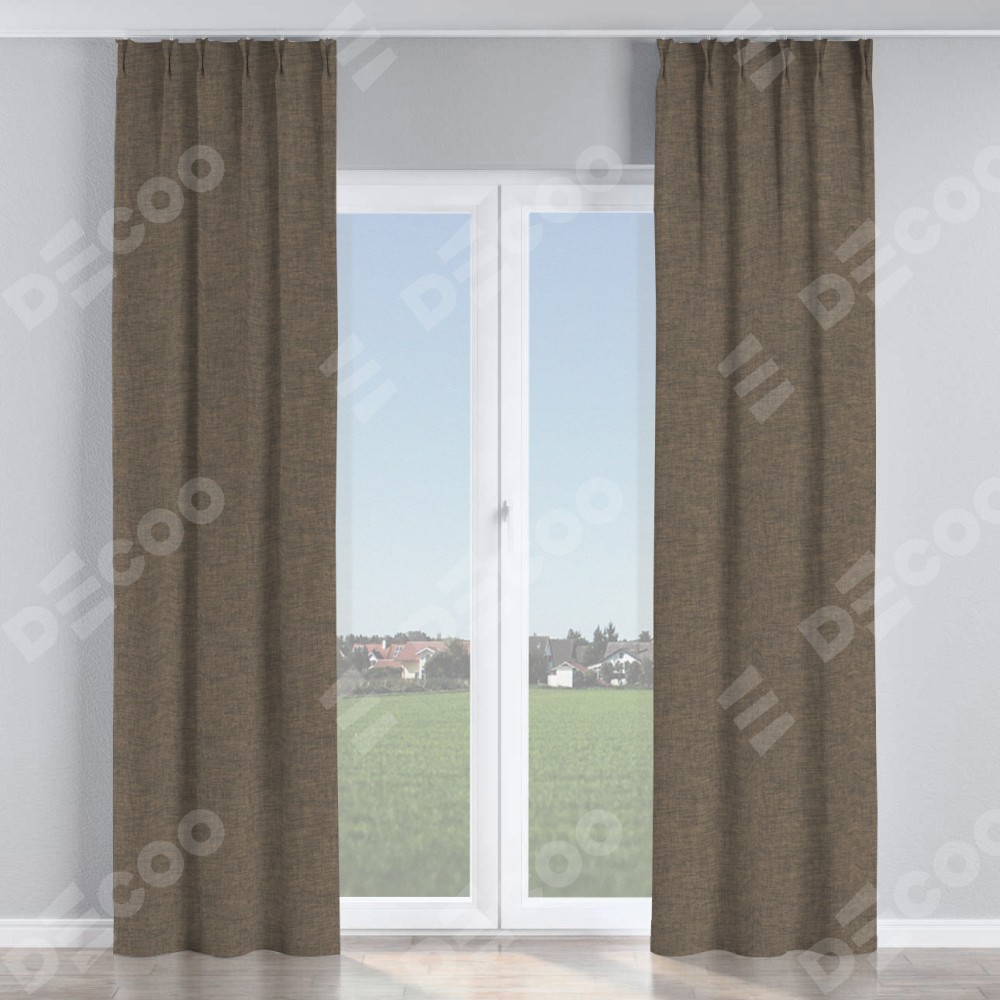Комплект прямых штор, от производителя «Cortin», пошиты из ткани рогожка димаут коричневый, артикул ткани 80420. С изнаночной стороны в верхней части штор пристрачивается шторная лента с декоративными складками «Кустик». Для создания элегантных складок прямые шторы шьются по стандарту с коэффициентом 1:2 (на 100 см. ширины проёма 200 см. ширины ткани).