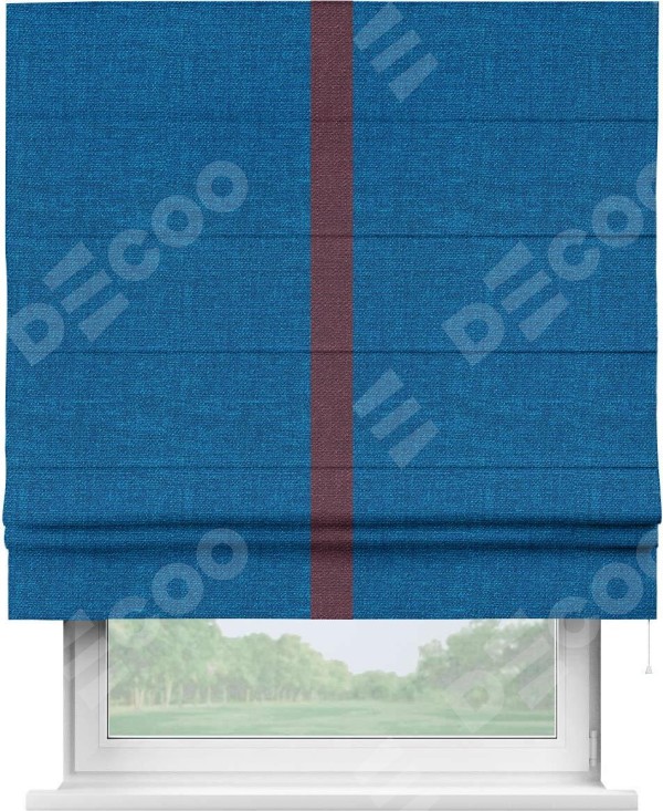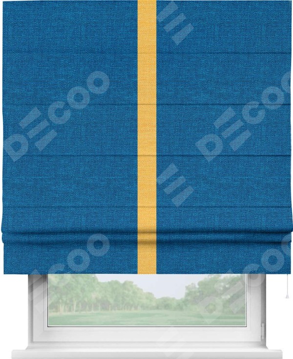 Римская штора производителя «Cortin», используется для проёма, пошита из ткани лён синий, артикул 63742. Отделка шторы кантом «Хайвэй», ткань для канта используется из льна разной расцветки на выбор. Имеет универсальный механизм и подходит для монтажа: на потолок, на стену и в нишу.
