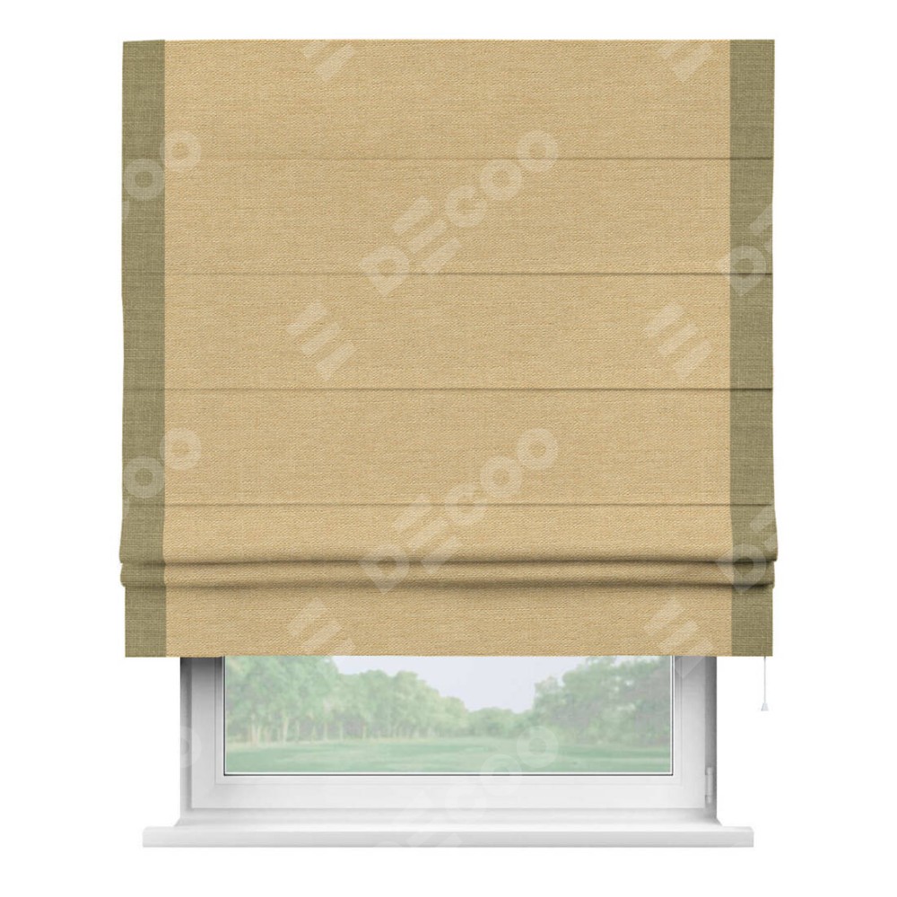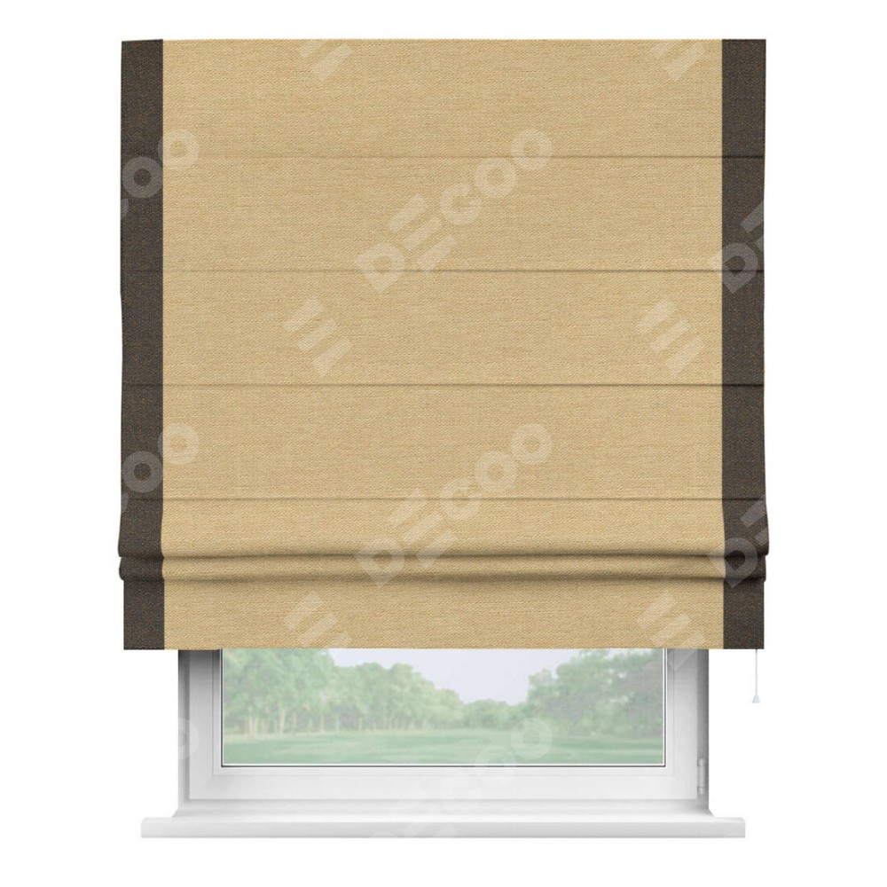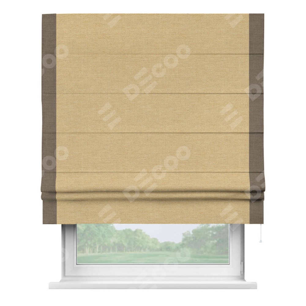 Римская штора производителя «Cortin», используется для проёма, пошита из ткани лён темно-бежевый, артикул 53433. Отделка шторы кантом «Стрим Дуо», ткань для канта используется из льна разной расцветки на выбор. Имеет универсальный механизм и подходит для монтажа: на потолок, на стену и в нишу.