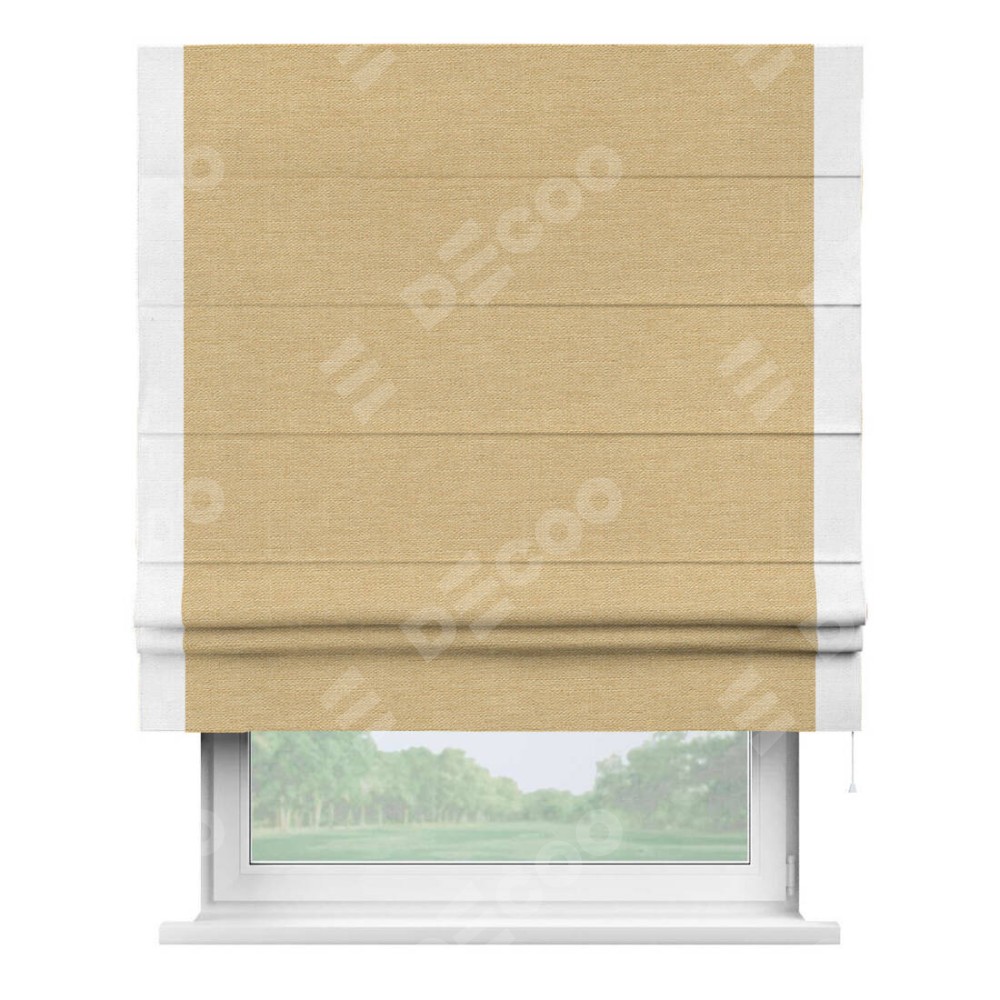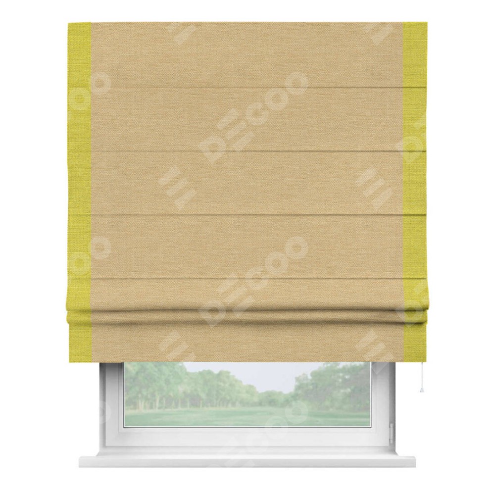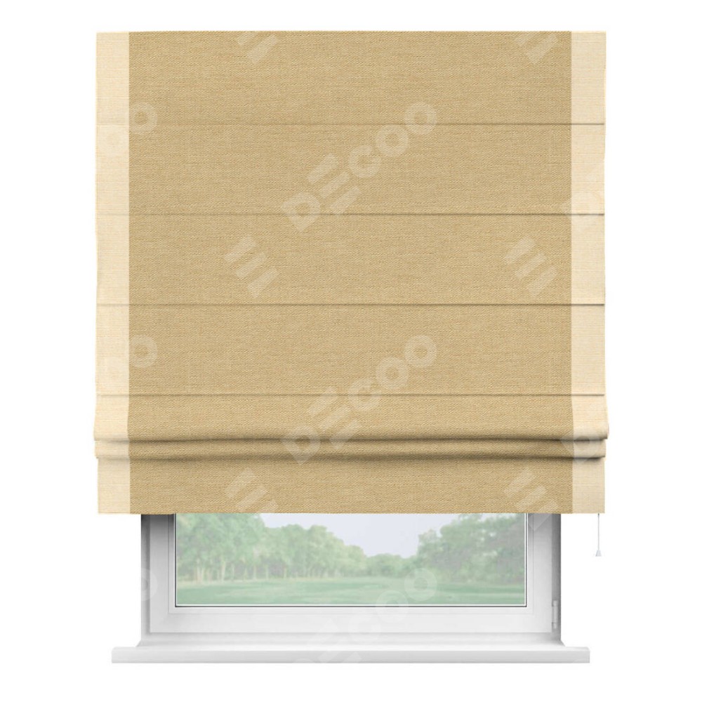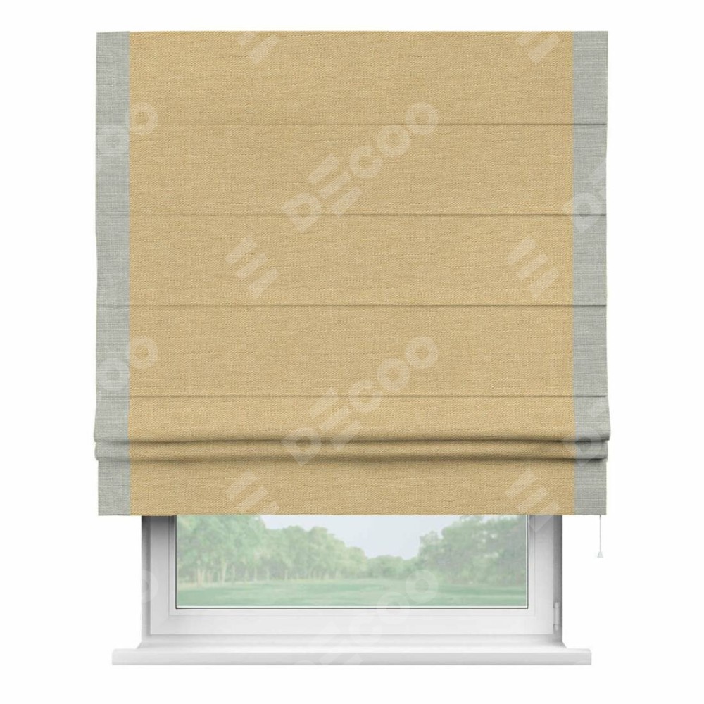 Римская штора производителя «Cortin», используется для проёма, пошита из ткани лён темно-бежевый, артикул 53433. Отделка шторы кантом «Стрим Дуо», ткань для канта используется из льна разной расцветки на выбор. Имеет универсальный механизм и подходит для монтажа: на потолок, на стену и в нишу.