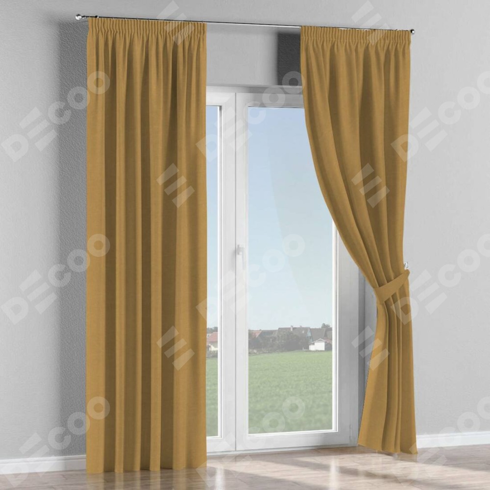 Комплект прямых штор, от производителя «Cortin», пошиты из ткани вельвет горчица, артикул ткани 17760. С изнаночной стороны в верхней части штор пристрачивается шторная лента с декоративными складками «Карандаш». Для создания элегантных складок прямые шторы шьются по стандарту с коэффициентом 1:2 (на 100 см. ширины проёма 200 см. ширины ткани).