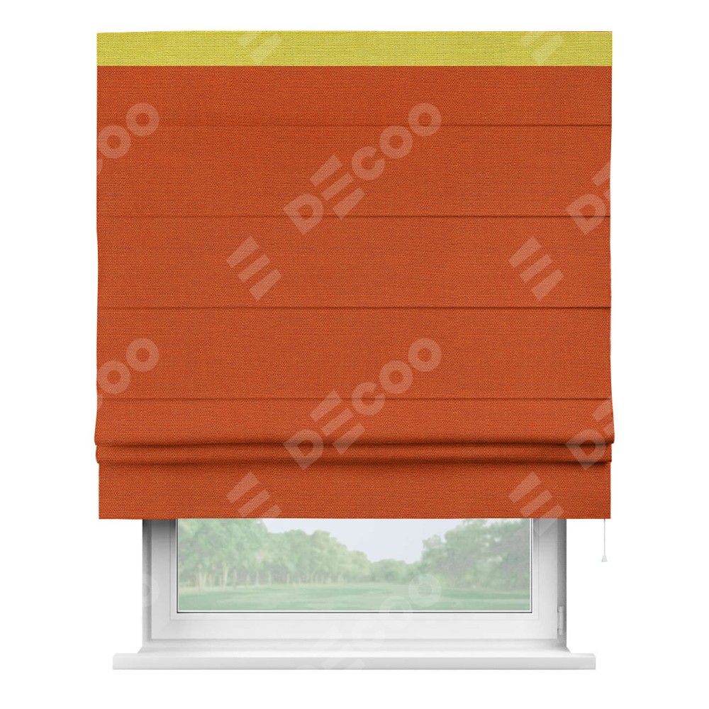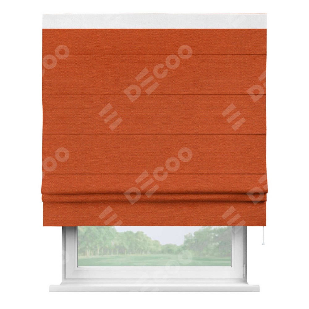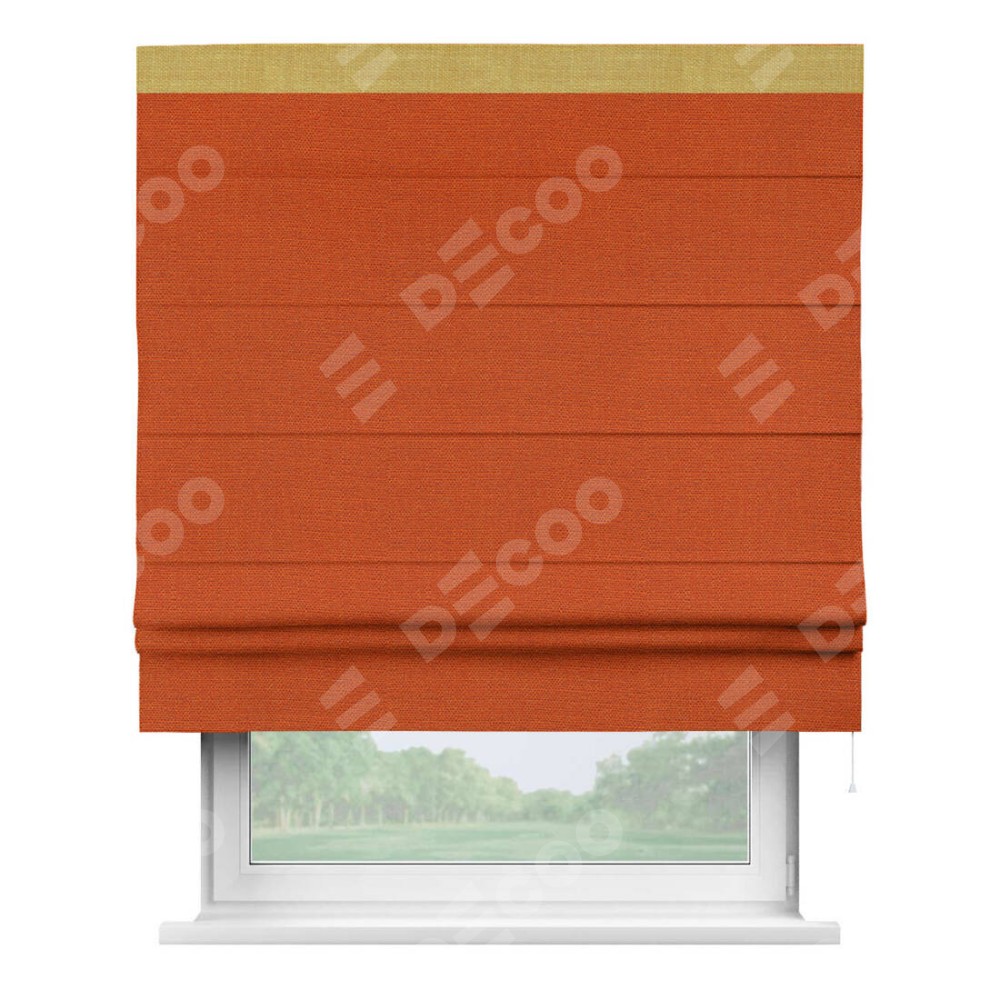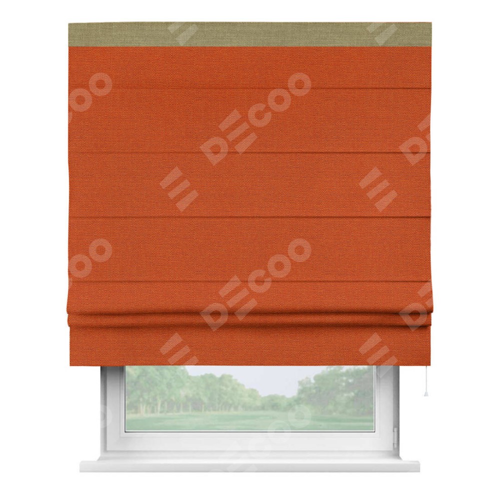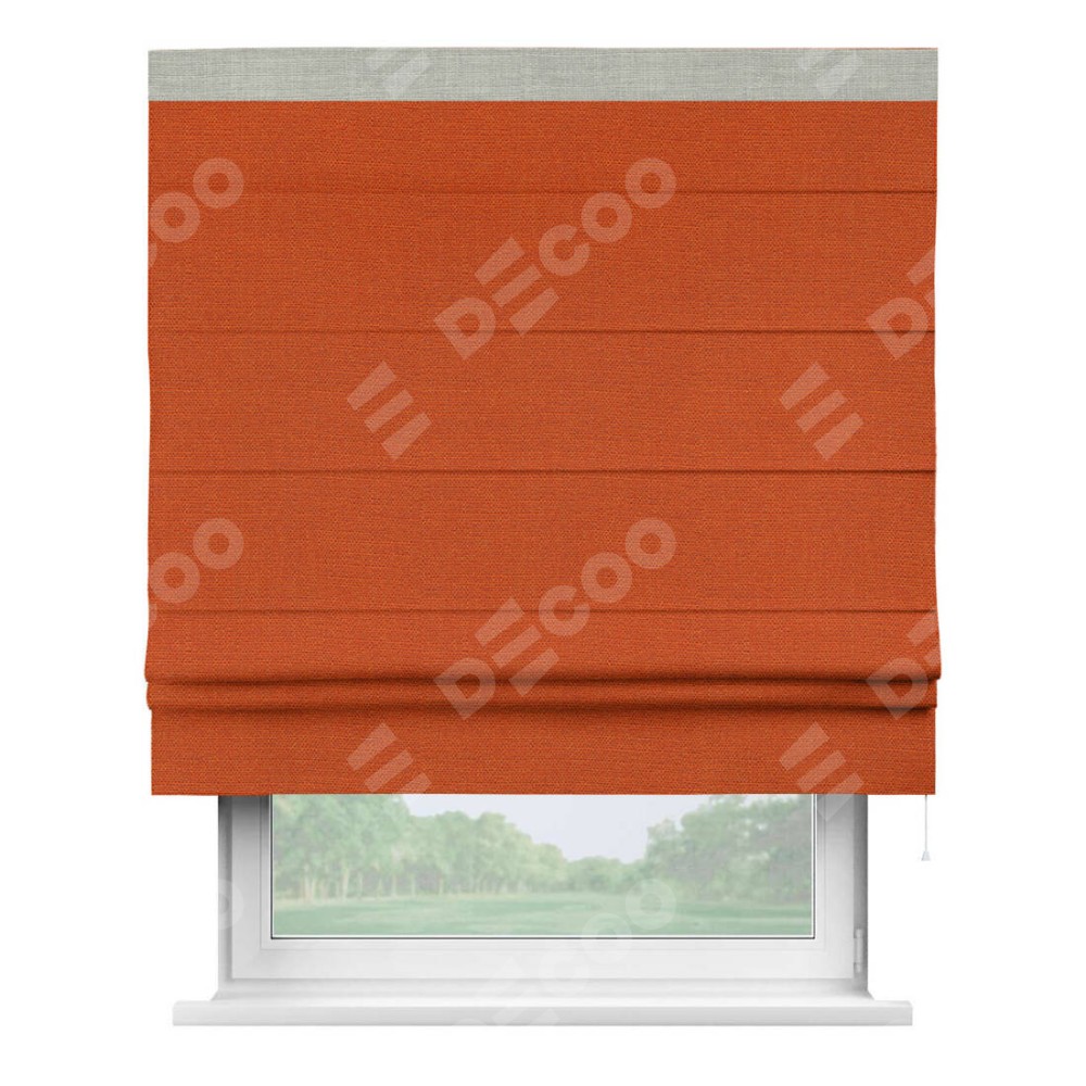 Римская штора производителя «Cortin», используется для проёма, пошита из ткани лён терракотовый, артикул 53440. Отделка шторы кантом «Кинг», ткань для канта используется из льна разной расцветки на выбор. Имеет универсальный механизм и подходит для монтажа: на потолок, на стену и в нишу.