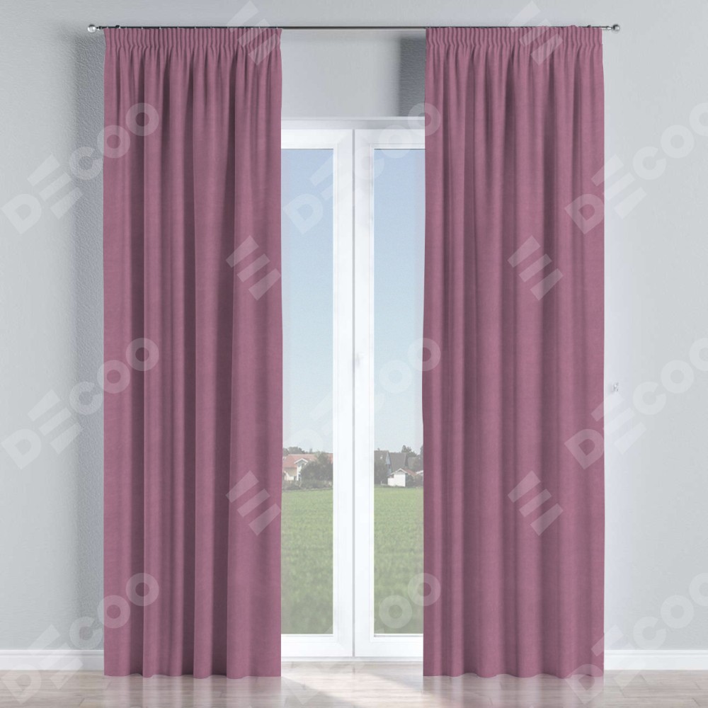 Комплект прямых штор, от производителя «Cortin», пошиты из ткани вельвет лиловый, артикул ткани 17752. С изнаночной стороны в верхней части штор пристрачивается шторная лента с декоративными складками «Карандаш». Для создания элегантных складок прямые шторы шьются по стандарту с коэффициентом 1:2 (на 100 см. ширины проёма 200 см. ширины ткани).