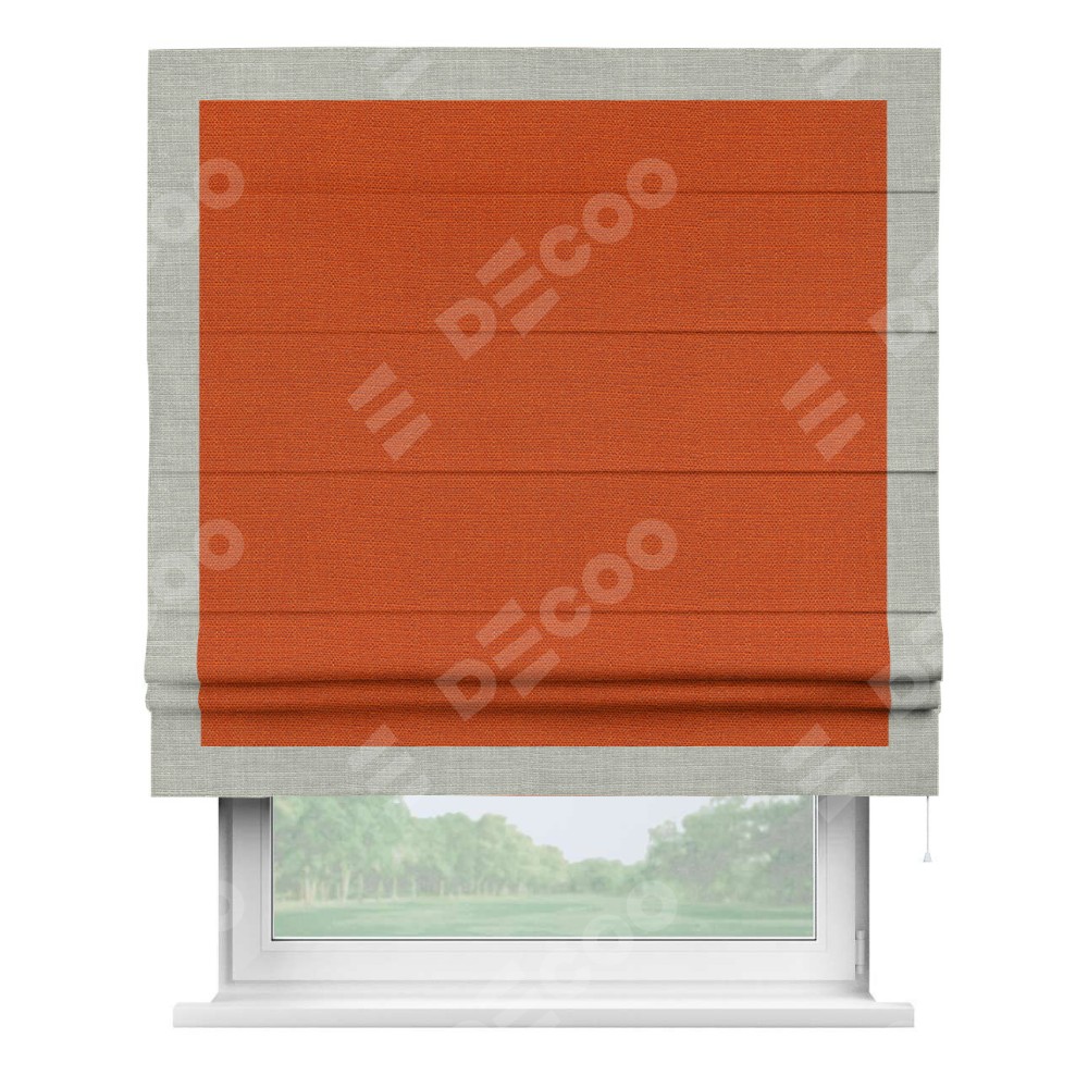 Римская штора производителя «Cortin», используется для проёма, пошита из ткани лён терракотовый, артикул 53440. Отделка шторы кантом «Чесс», ткань для канта используется из льна разной расцветки на выбор. Имеет универсальный механизм и подходит для монтажа: на потолок, на стену и в нишу.