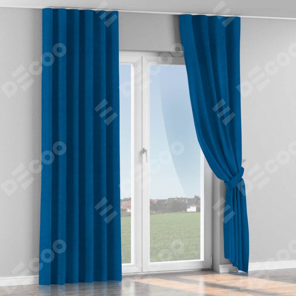 Комплект прямых штор, от производителя «Cortin», пошиты из ткани вельвет синий, артикул ткани 85554. С изнаночной стороны в верхней части штор пристрачивается шторная лента с декоративными складками «Волна». Для создания элегантных складок прямые шторы шьются по стандарту с коэффициентом 1:2 (на 100 см. ширины проёма 200 см. ширины ткани).