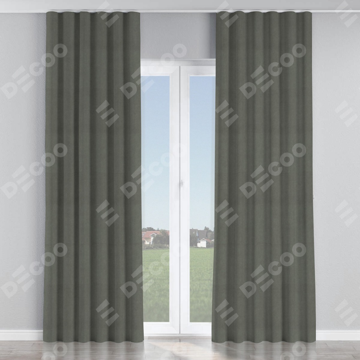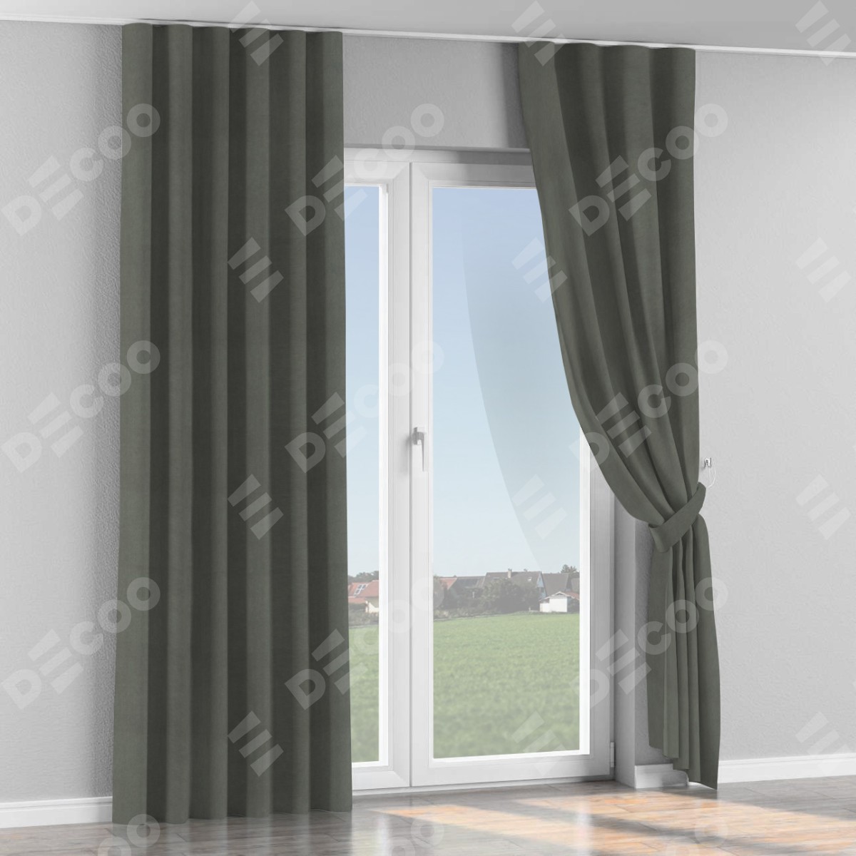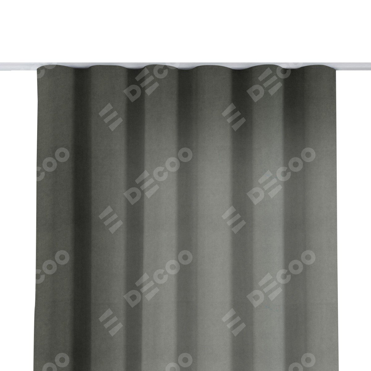 Комплект прямых штор, от производителя «Cortin», пошиты из ткани вельвет тёмно-серый, артикул ткани 85542. С изнаночной стороны в верхней части штор пристрачивается шторная лента с декоративными складками «Волна». Для создания элегантных складок прямые шторы шьются по стандарту с коэффициентом 1:2 (на 100 см. ширины проёма 200 см. ширины ткани).