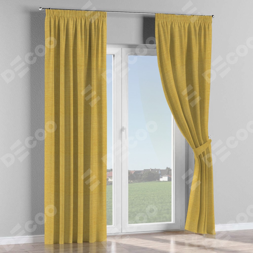 Комплект прямых штор, от производителя «Cortin», пошиты из ткани лён горчичный, артикул ткани 74740. С изнаночной стороны в верхней части штор пристрачивается шторная лента с декоративными складками «Карандаш». Для создания элегантных складок прямые шторы шьются по стандарту с коэффициентом 1:2 (на 100 см. ширины проёма 200 см. ширины ткани).
