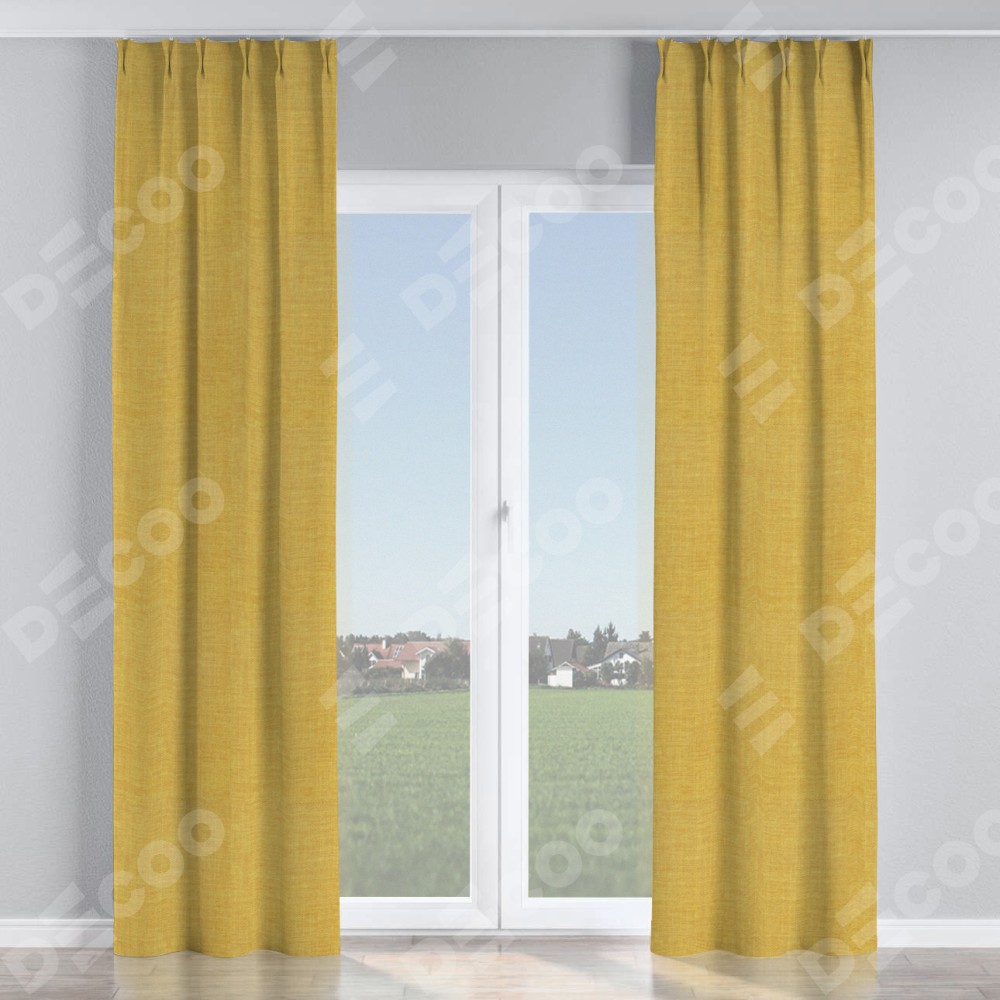 Комплект прямых штор, от производителя «Cortin», пошиты из ткани лён горчичный, артикул ткани 74740. С изнаночной стороны в верхней части штор пристрачивается шторная лента с декоративными складками «Кустик». Для создания элегантных складок прямые шторы шьются по стандарту с коэффициентом 1:2 (на 100 см. ширины проёма 200 см. ширины ткани).