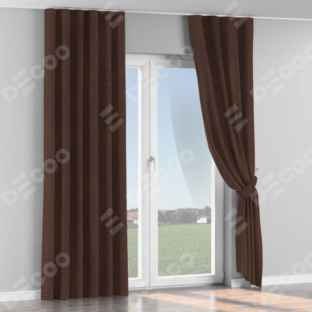 Комплект прямых штор, от производителя «Cortin», пошиты из ткани лён коричневый, артикул ткани 53443. С изнаночной стороны в верхней части штор пристрачивается шторная лента с декоративными складками «Волна». Для создания элегантных складок прямые шторы шьются по стандарту с коэффициентом 1:2 (на 100 см. ширины проёма 200 см. ширины ткани).