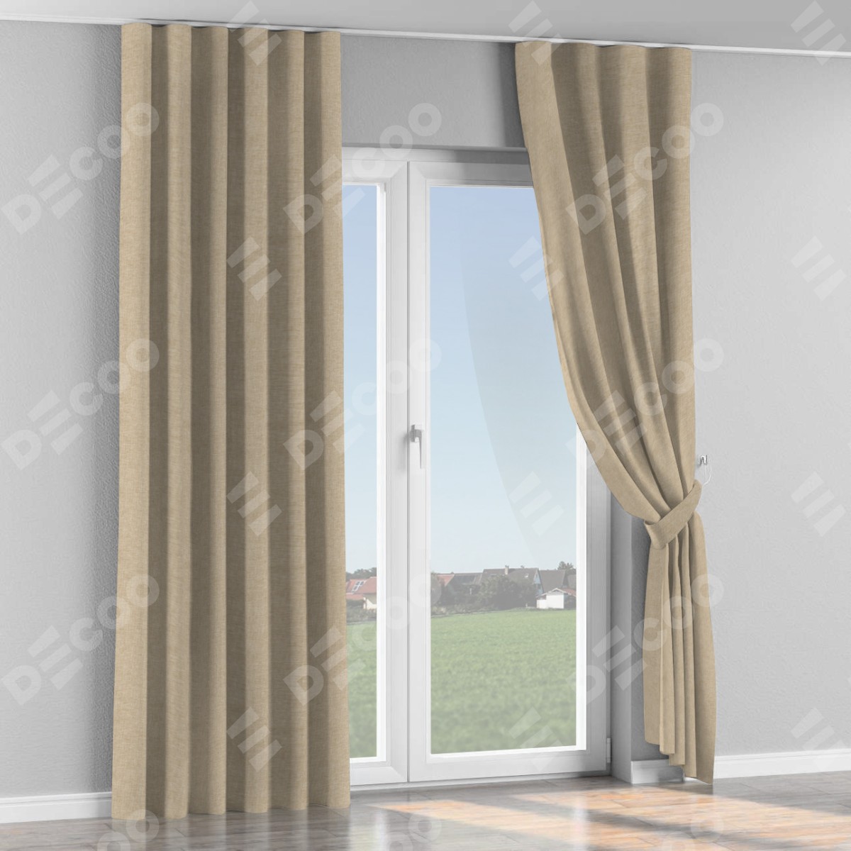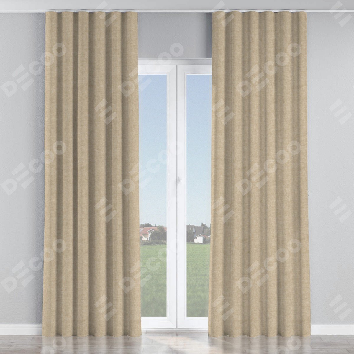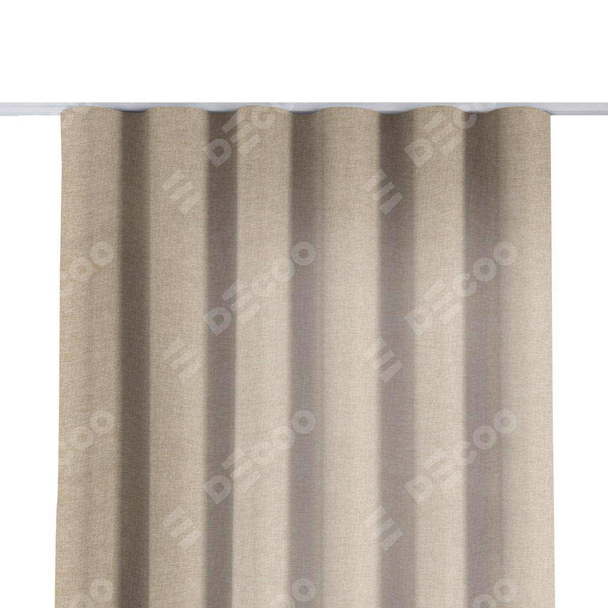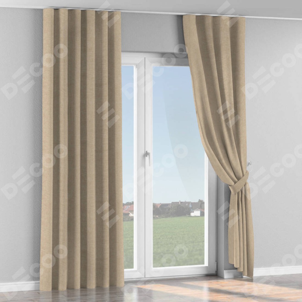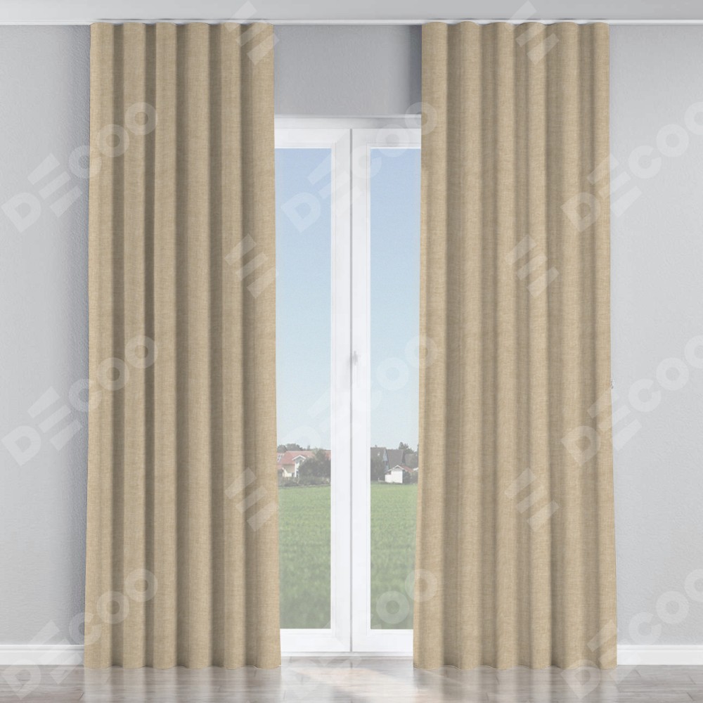 Комплект прямых штор, от производителя «Cortin», пошиты из ткани лён кашемир бежевый, артикул ткани 17206. С изнаночной стороны в верхней части штор пристрачивается шторная лента с декоративными складками «Волна». Для создания элегантных складок прямые шторы шьются по стандарту с коэффициентом 1:2 (на 100 см. ширины проёма 200 см. ширины ткани).