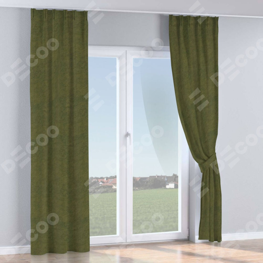 Комплект прямых штор, от производителя «Cortin», пошиты из ткани софт однотонный зелёный, артикул ткани 33110. С изнаночной стороны в верхней части штор пристрачивается шторная лента с декоративными складками «Кустик». Для создания элегантных складок прямые шторы шьются по стандарту с коэффициентом 1:2 (на 100 см. ширины проёма 200 см. ширины ткани).